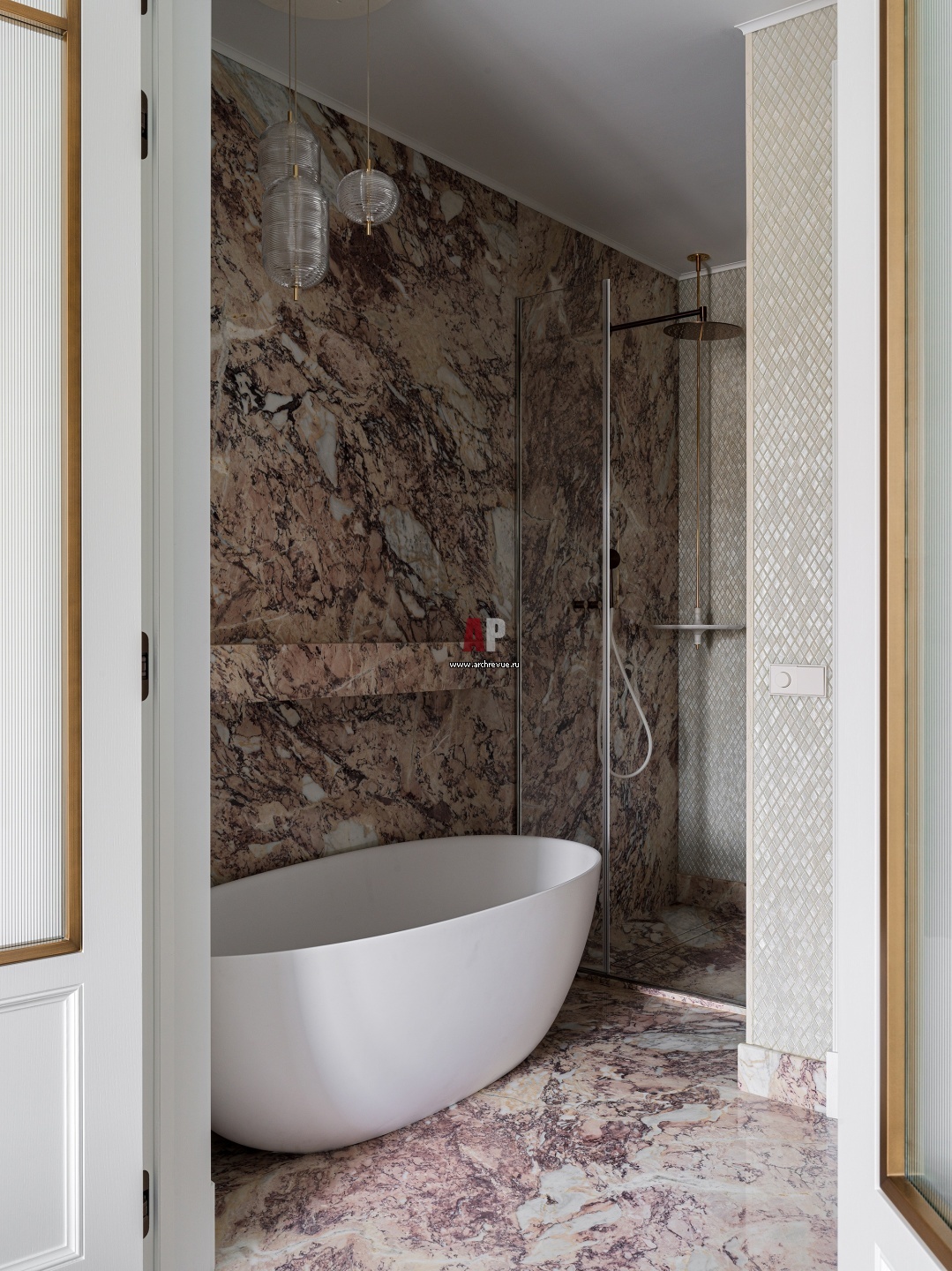 Хозяйская ванная отделана розовым мрамором, акценты на стене – мозаика, Sicis. Отдельно стоящая ванна, Antonio Lupi. Смесители и аксессуары, Cea. Люстра, Studio Italia Design.