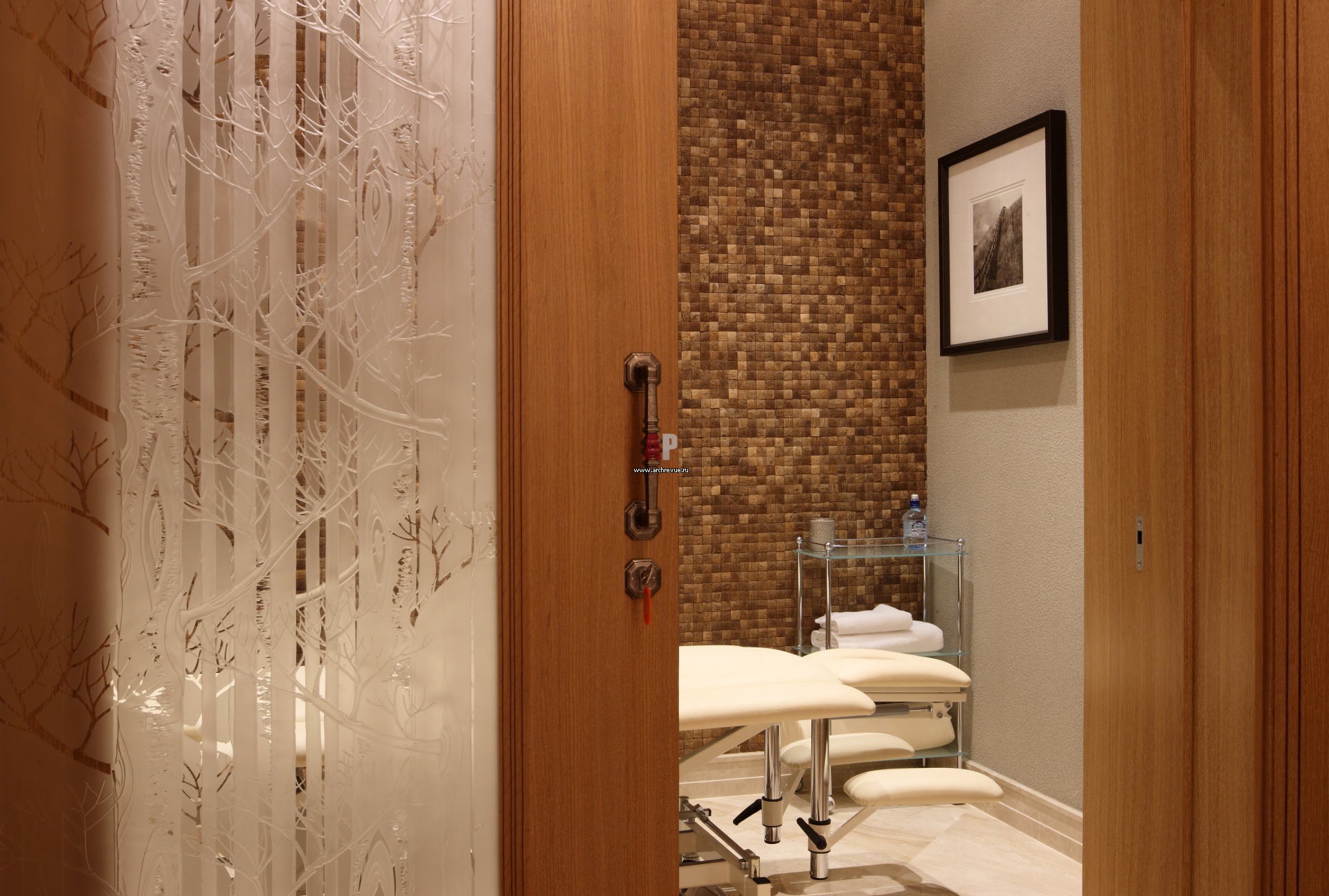 Вид на массажный кабинет. Дверь украшена витражом со скульптурной гравировкой, в основе сюжета – стволы деревьев сказочного леса.