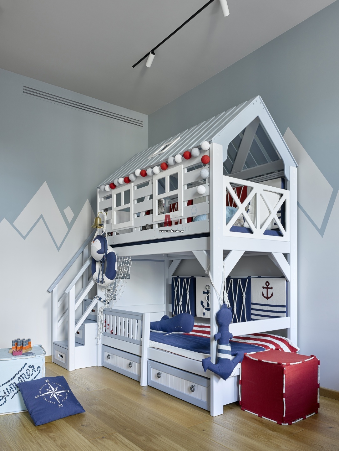 Интерьер детской комнаты с морским дизайном. Двухъярусная кровать сделана на заказ по эскизам архитекторов.