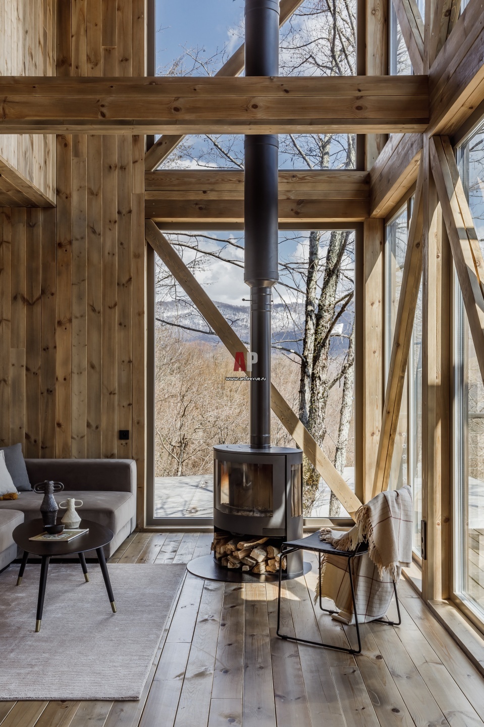 Двусветная гостиная. Лаконичный металлический камин Panadero (модель Iris) имеет три стеклянные вставки, они обеспечивают панорамный обзор.