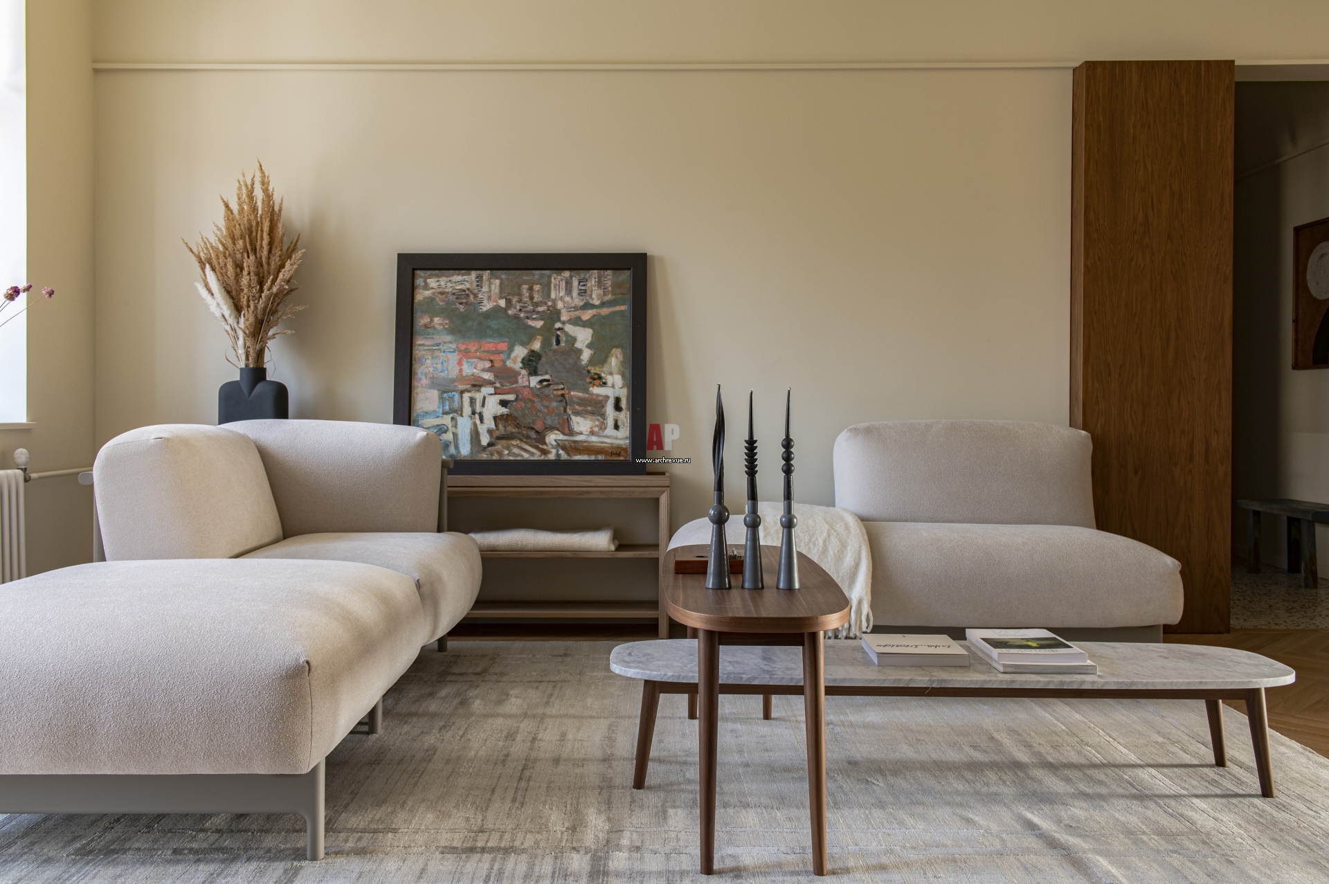 Основной цвет интерьера гостиной был выбран так, чтобы максимально попасть в оттенок столешницы и фартука кухни. В итоге выбрана матовая моющаяся краска Argile в цвете Blanc D’etretat.