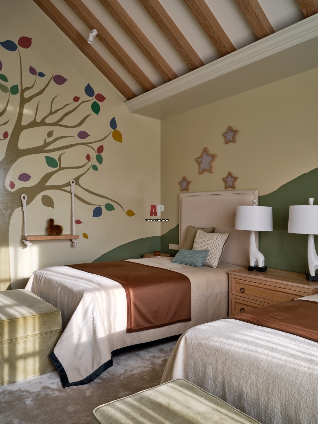 Так как детская используется и как спальня, и как игровая, стены оформлены магнитно-маркерными красками, которые служат для развивающих игр малышей.