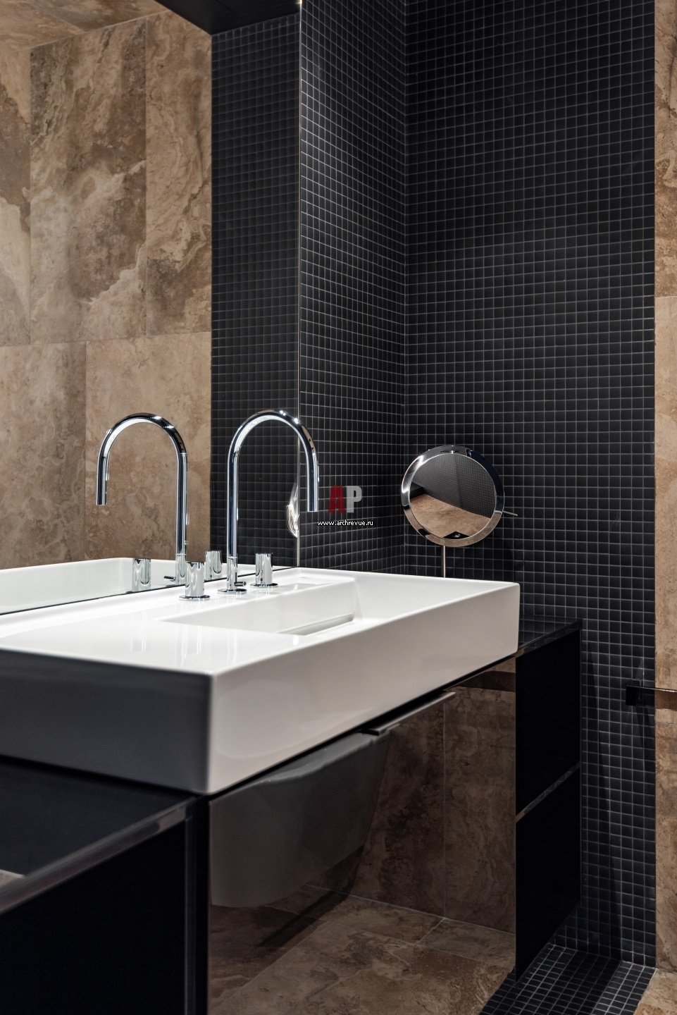 Санузел. Стены оформлены травертином. Сантехника, Laufen.