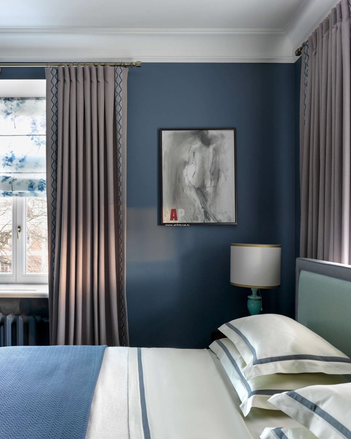 Интерьер спальни в синих тонах. Рисунок на стене работы Михаила Тихонова.
