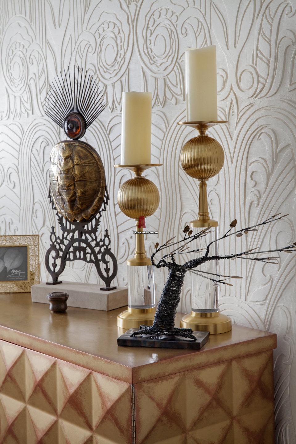 Фото интерьера гостиной в стиле американского ар-деко. Стены украшены белыми барельефами с характерной растительной орнаментикой.