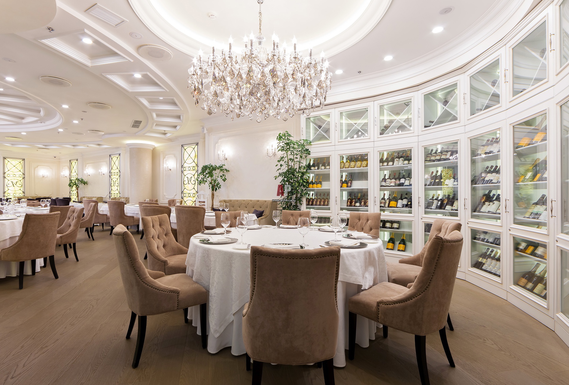 Дизайн парадного ресторана высокой итальянской кухни выдержан в классическом стиле. Круглые столы с белыми скатертями, стулья цвета кофе с молоком выполнены на заказ.