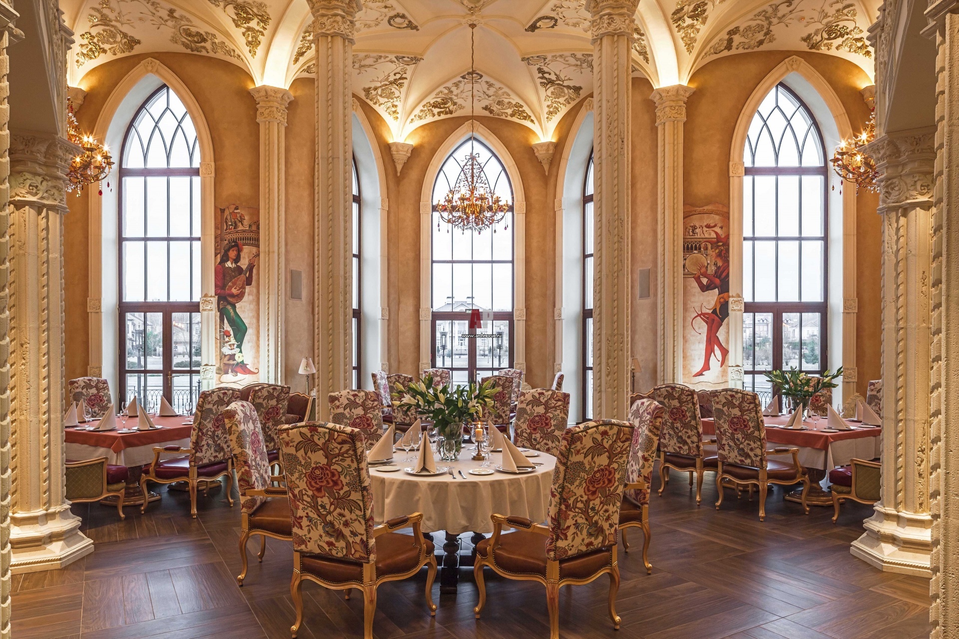 Ресторан в готическом стиле меблирован предметами французской фабрики Maison Coco с яркой цветовой гаммой и цветочными обивками.