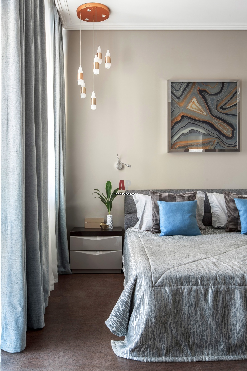 Интерьер хозяйской спальни выполнен в спокойной стилистике с серо-голубым текстилем.