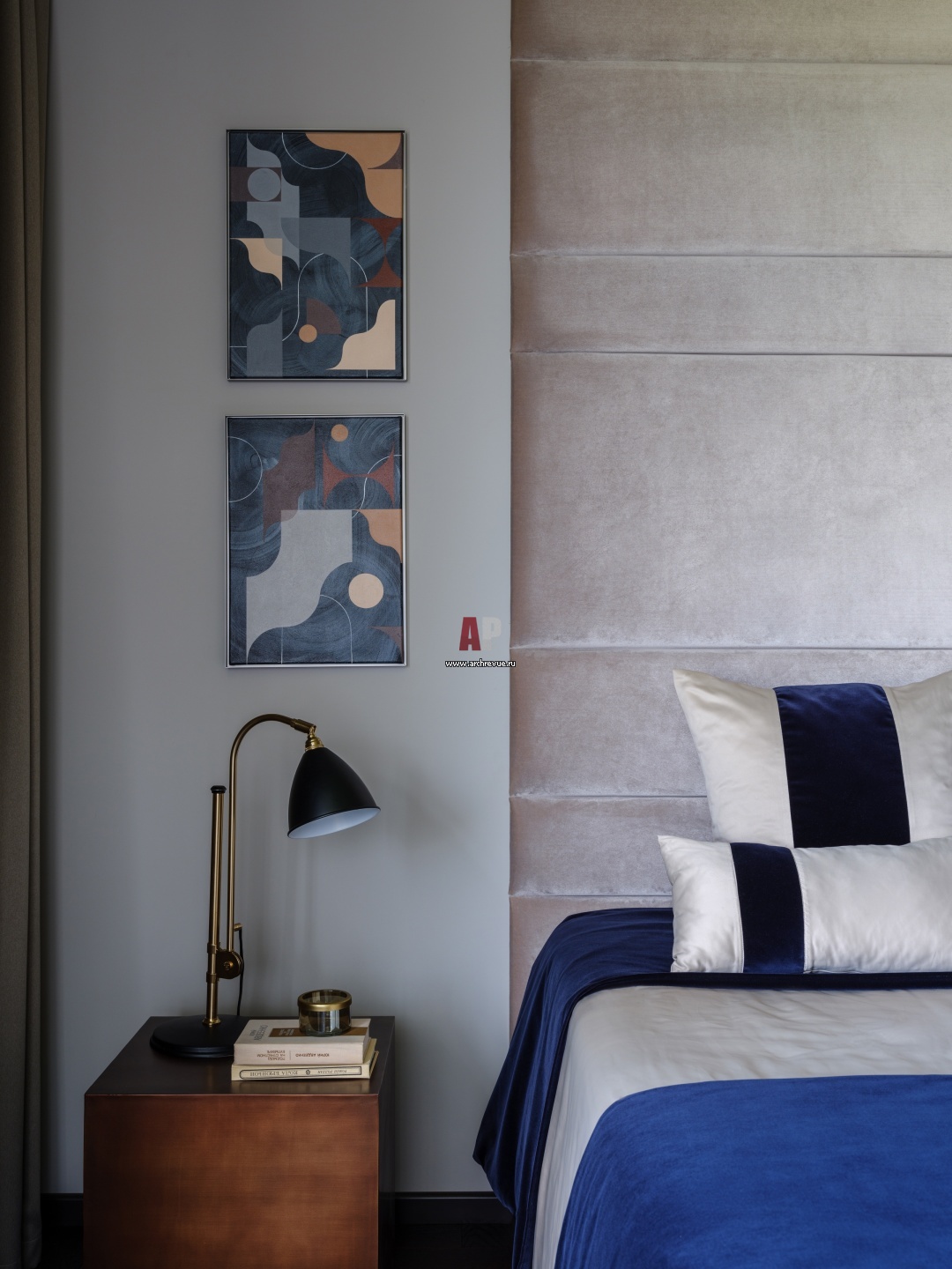 Фрагмент спальни в серо-синих тонах. Тумбы, Crate and Barrel. Светильник, Gubi.