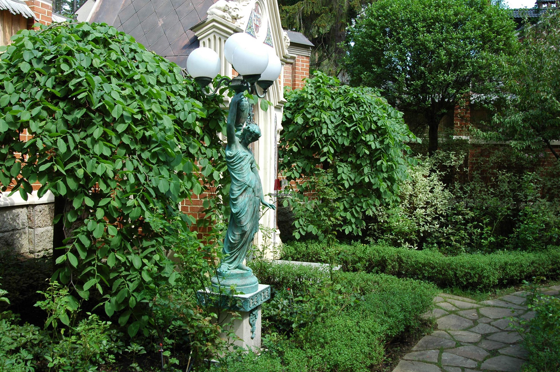 По обеим сторонам калитки установлены изящные фонари – фигуры девушек, несущих кувшины с водой. По стилю близкие к классицизму, они сделаны из бронзы на заказ, в мастерской Олега Климова.