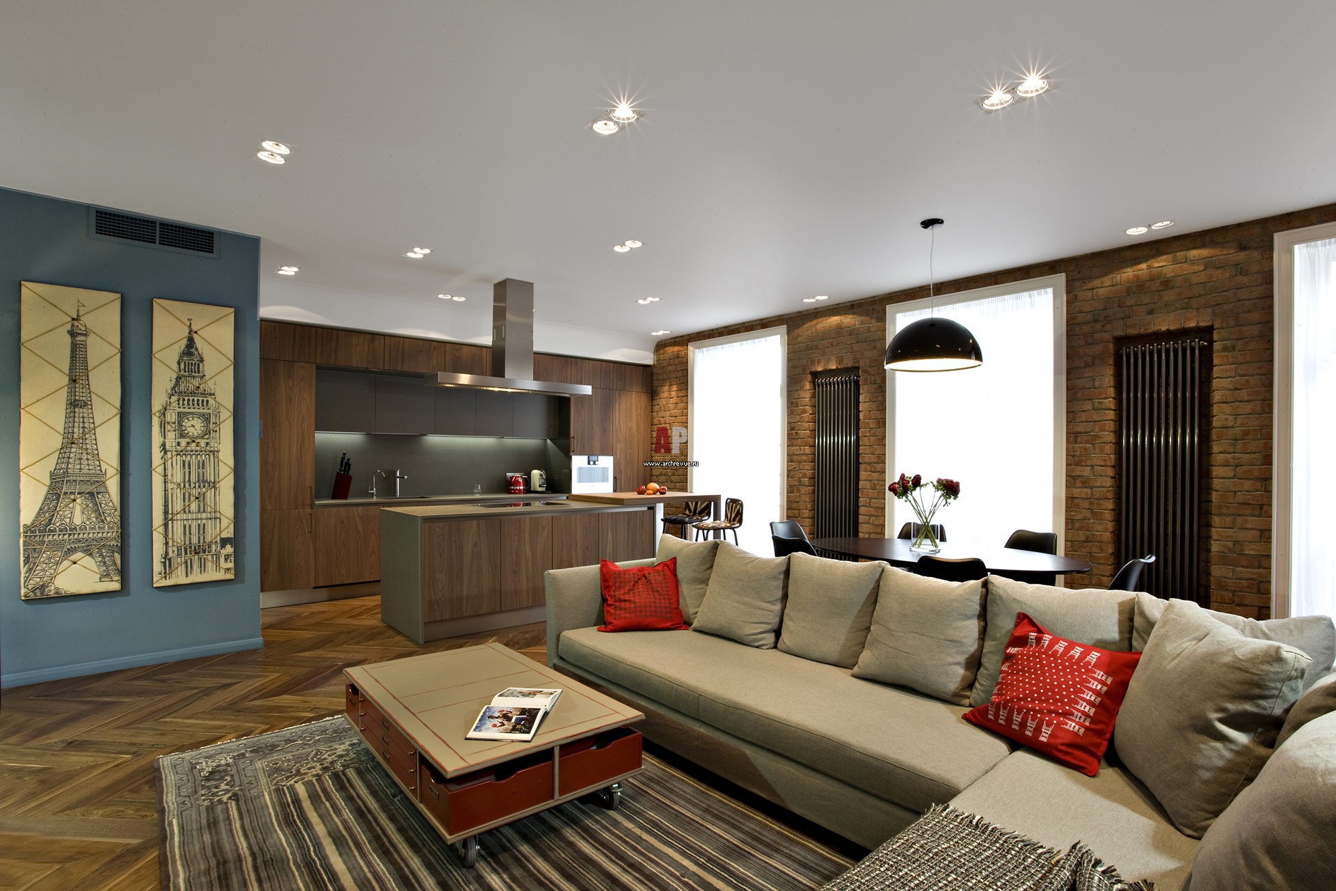 На фото – мужская квартира с гостиной-студией. Индустриальный облик интерьера создают кирпичные стены, встроенные в ниши вертикальные чугунные радиаторы, технологичная доска.