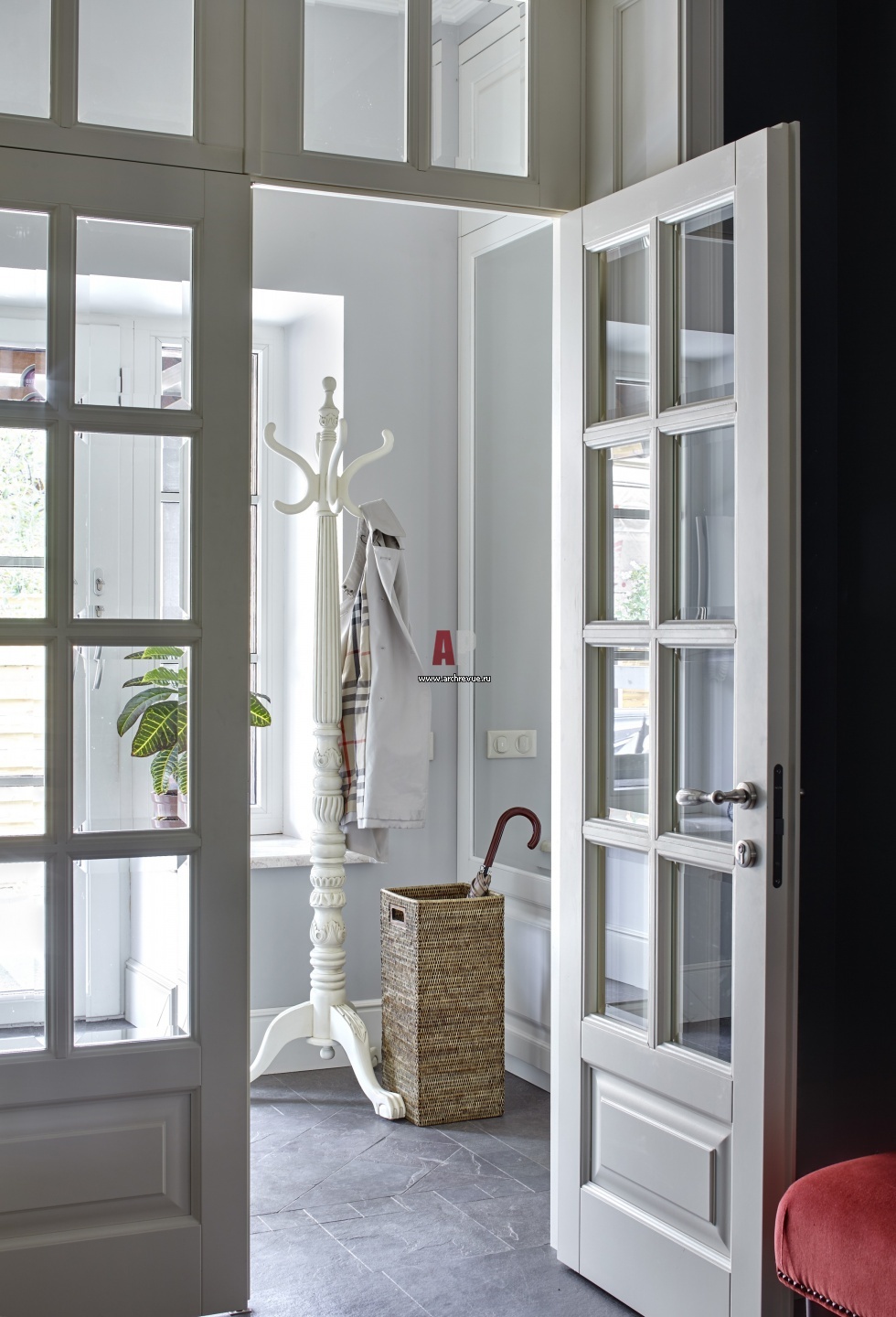 Историческую ценность места, где расположен дом, подчеркивают классические филенчатые двери со вставками из прозрачного стекла. На полу – сланец.