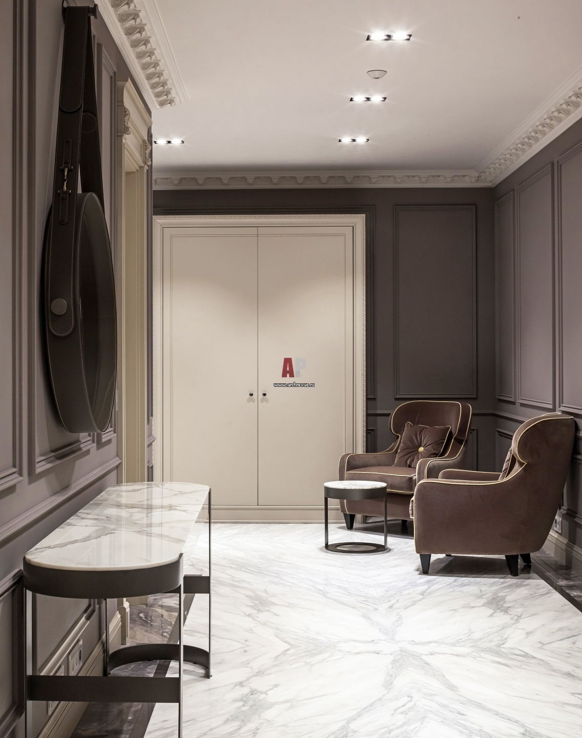 Интерьер прихожей в стиле неоклассика. Встроенный шкаф сделан на заказ, изготовление «АФ Ника». На полу – мрамор. Консоль, столик, круглое зеркало в кожаной раме, Frigerio.