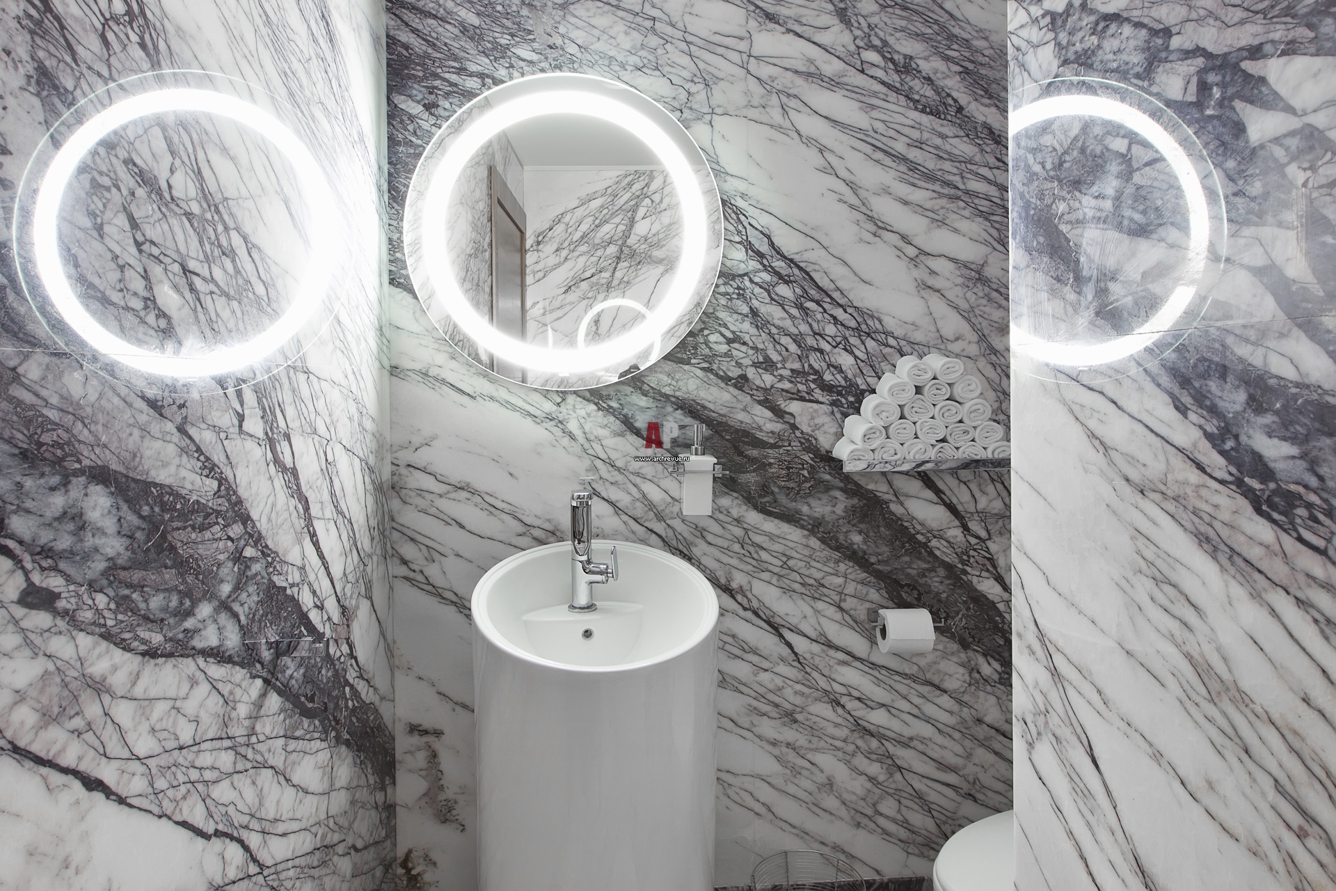 Интерьер санузла. С формой раковины рифмуется круглое зеркало. Его рама подсвечена, благодаря чему отражается на полированной поверхности мрамора.