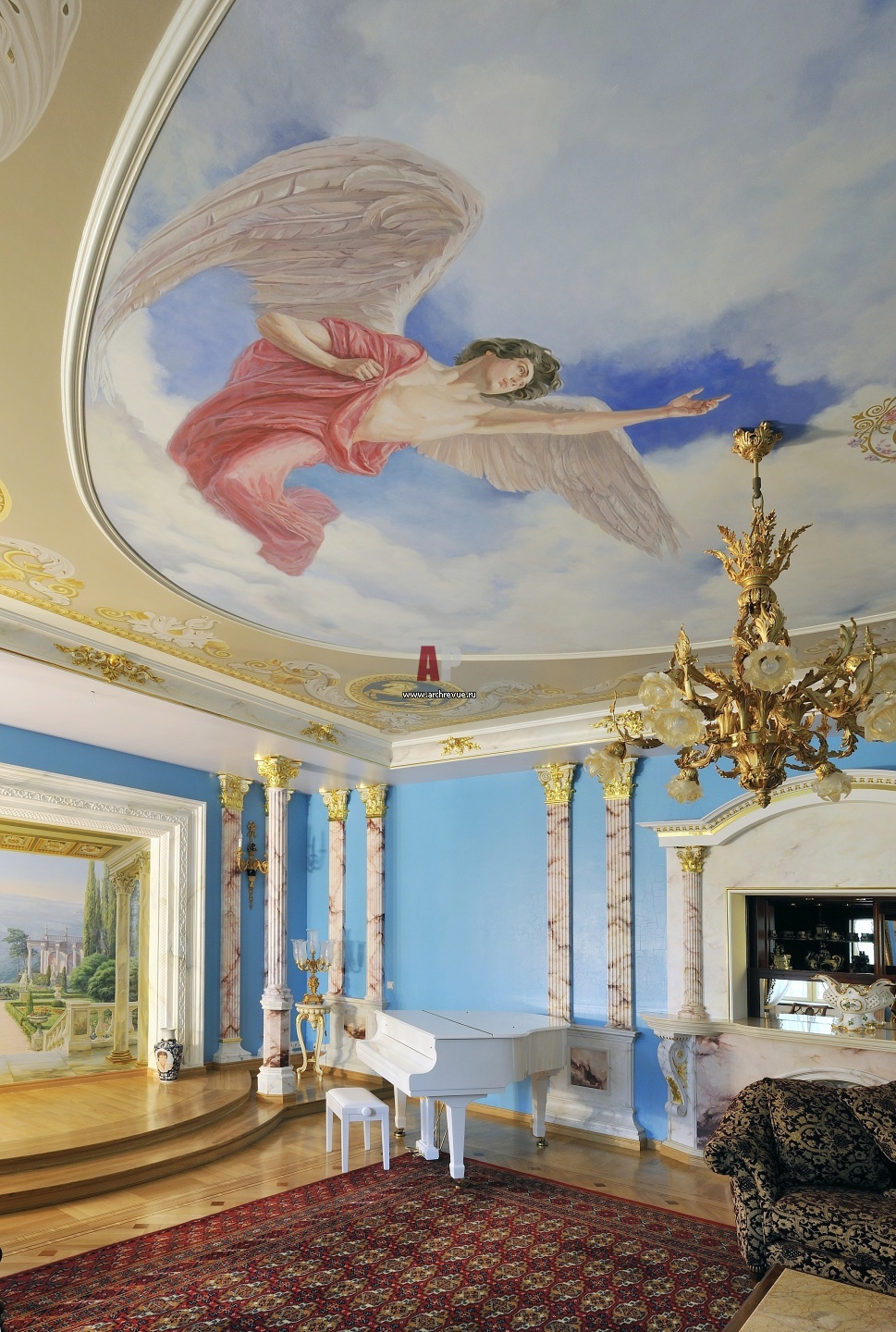 Музыкальная гостиная. Поточная розетка украшена монументальной авторской живописью. На полу – паркет из ценных пород дерева, узоры и орнаменты созданы по эскизам.