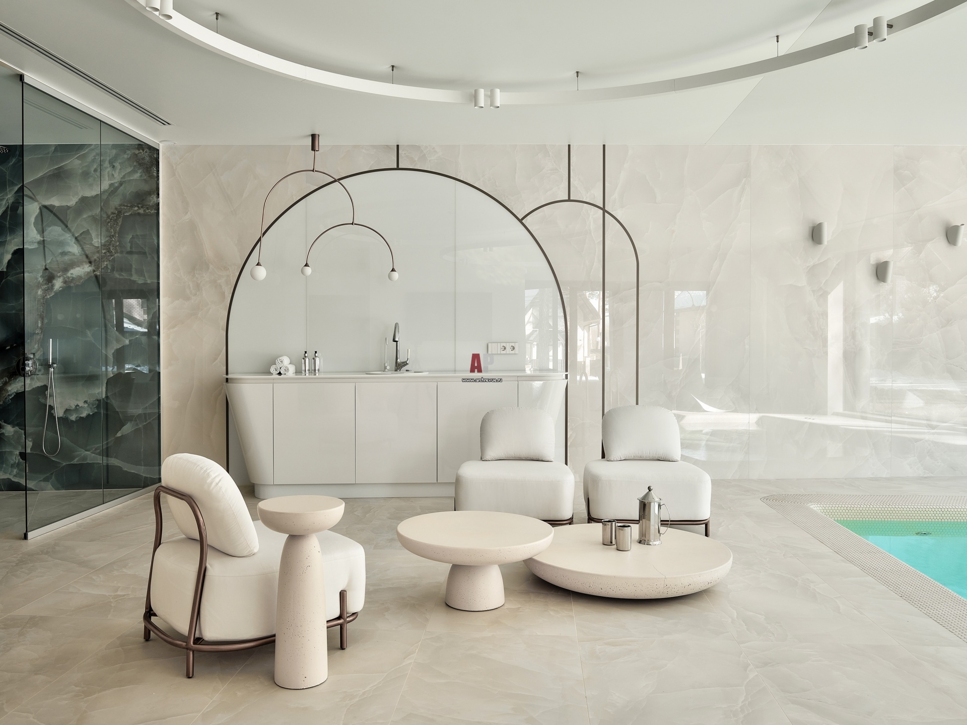 Барная зона с мини-кухней в бассейне. Гарнитур изготовлен по эскизам: с фронтальной стороны кухня имеет прямые фасады, с боков – радиальные, зауженные к низу. Фартук решен как арочное панно из просветленного молочного стекла.