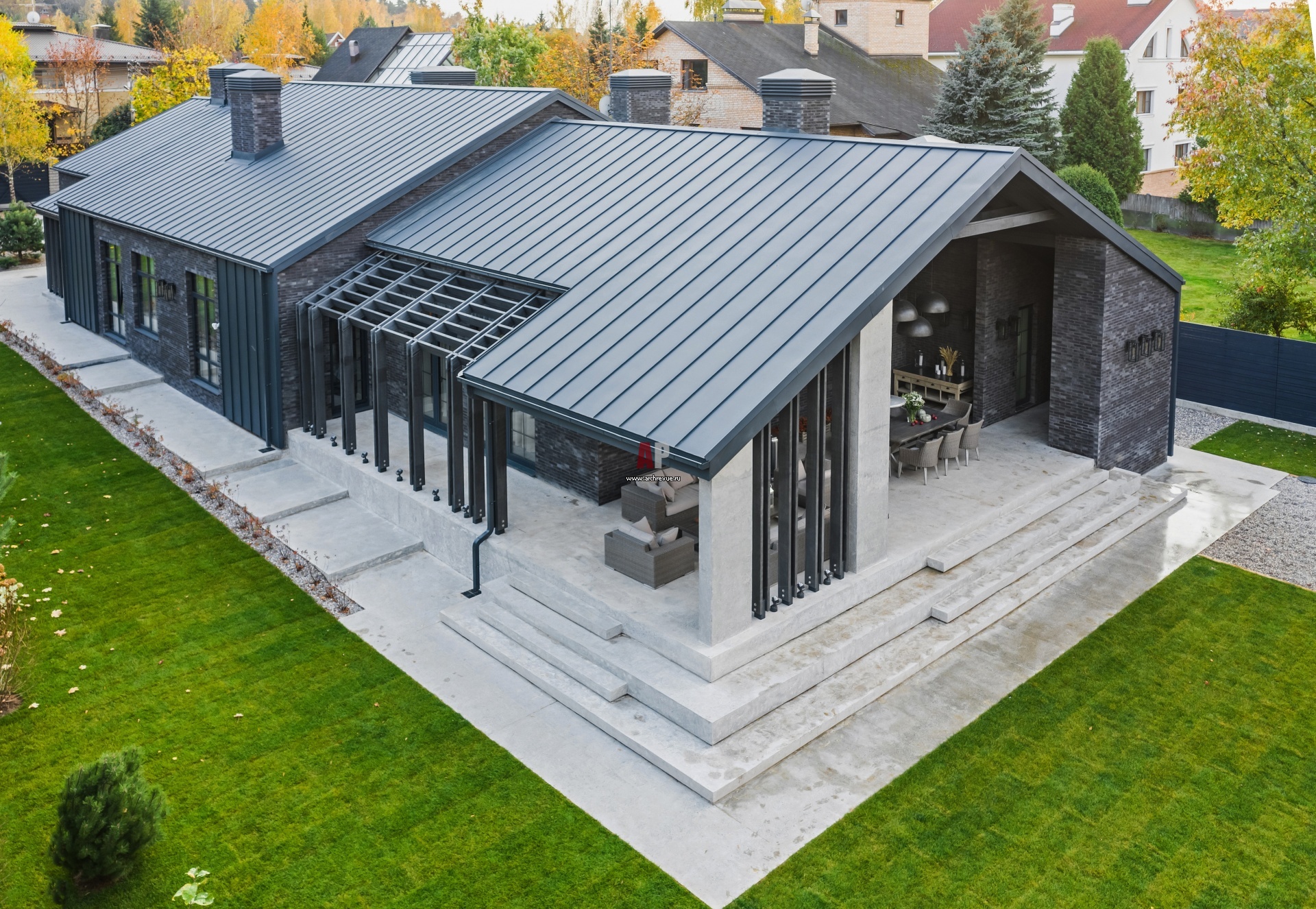 Архитектуру дома и его планировку определил участок вытянутой и узкой формы. Жилые помещения окружены террасами, с террас есть ступенчатый спуск на ландшафт. Он является своего рода продолжением террасы.