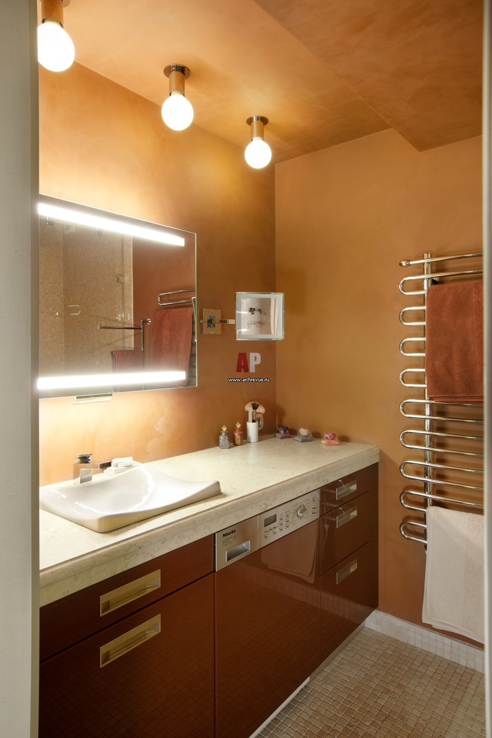 Стены ванной комнаты, как и основных пространств, декорированы терракотовыми финишными штукатурками, изготовление «Студия Марата Ка».