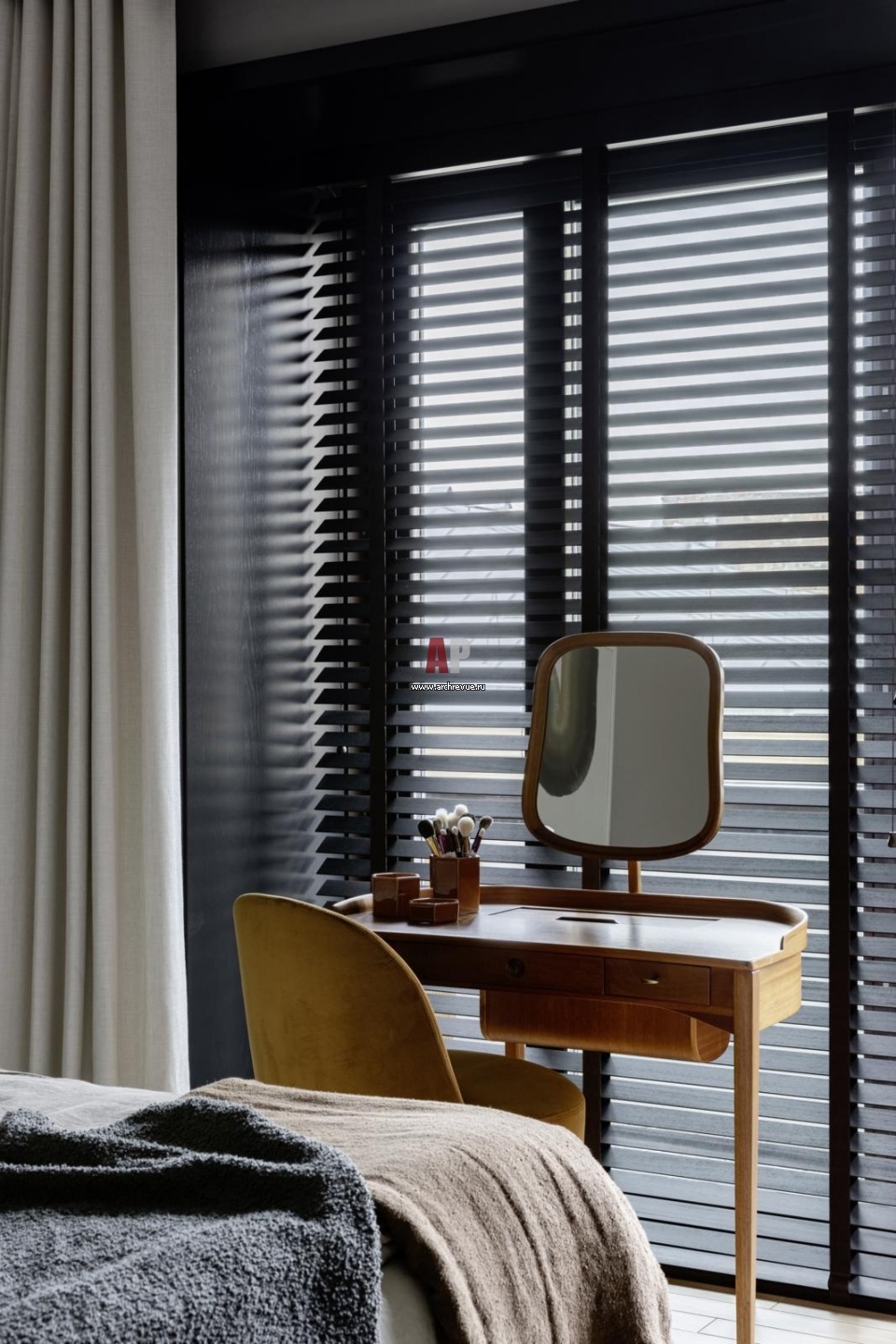 Между спальней и балконом установлены раздвижные дверь с темными деревянными жалюзи. Винтажный туалетный столик по дизайну Карла Мальмстена. Кресло, Gubi.