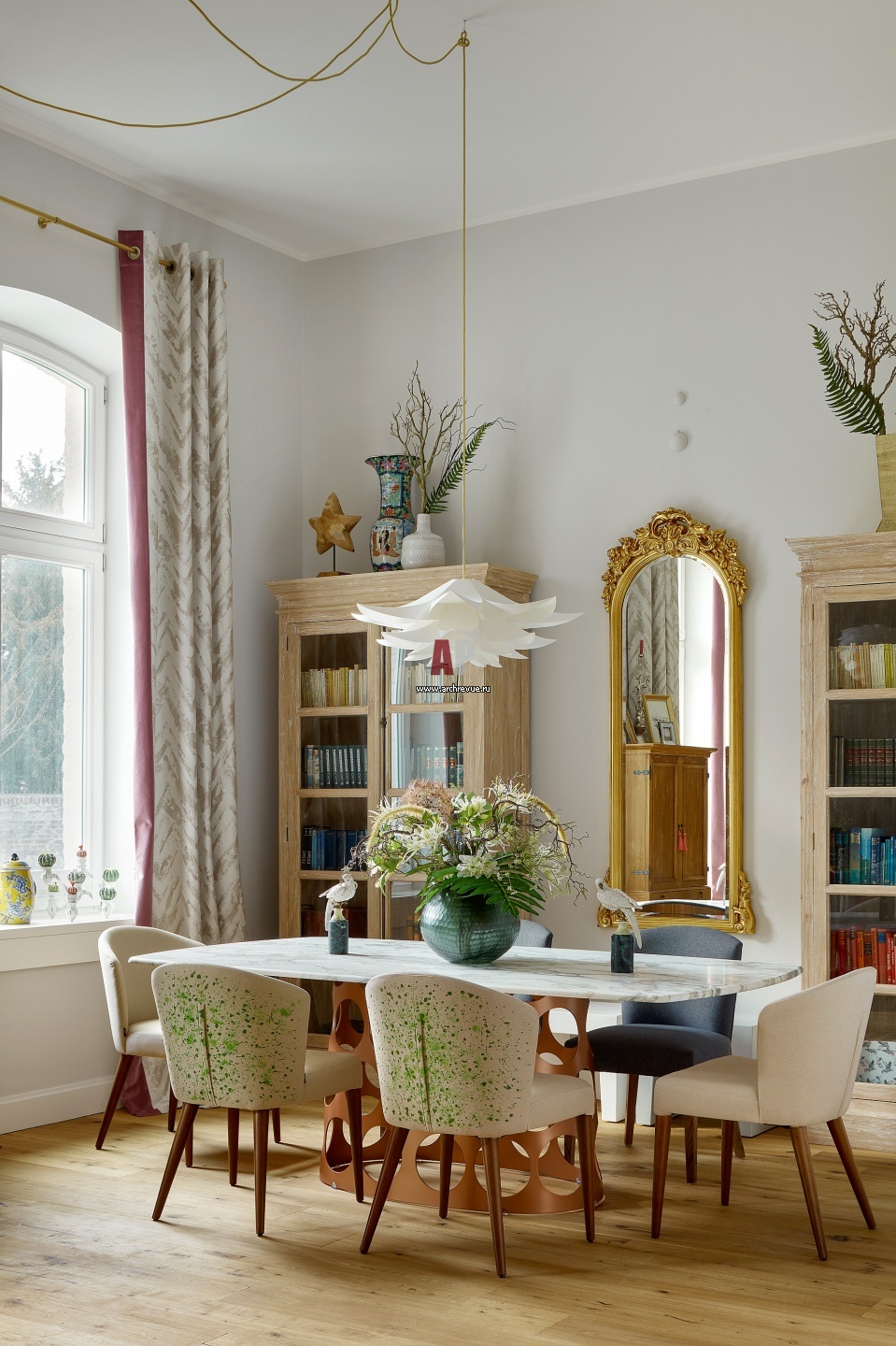 Зона столовой в общей гостиной. Обеденный стол, Porada. Стулья, Mobi. Люстра над обеденным столом, Normann Copenhagen.
