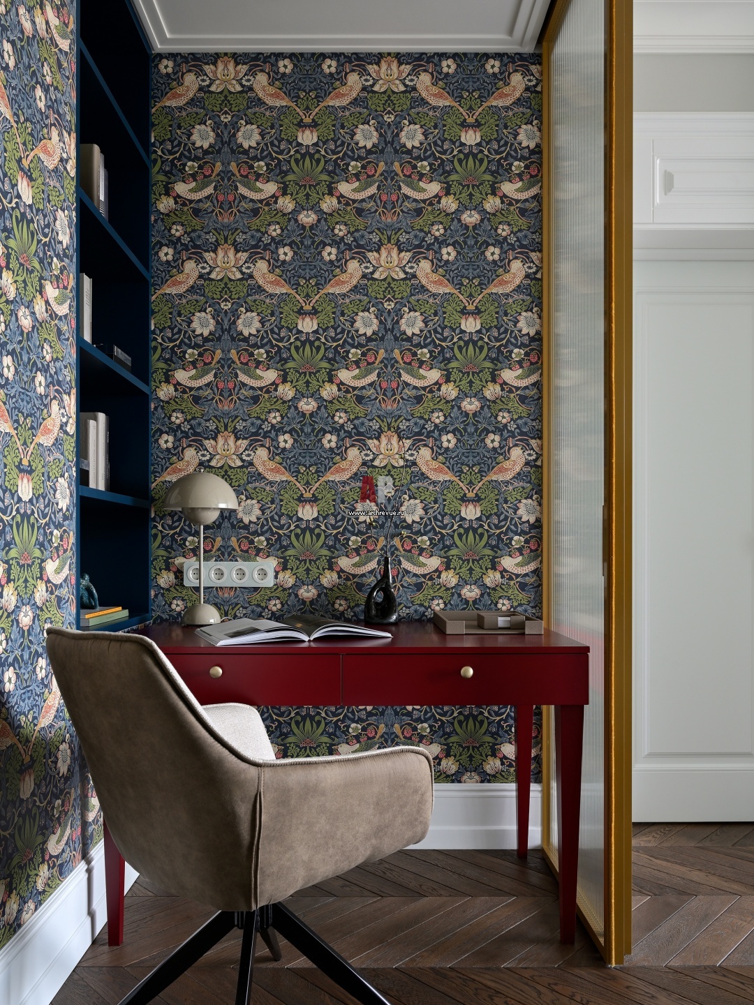 Зона кабинета-будуара при спальне сделана акцентной, с яркой палитрой и орнаментикой. Обои, Morris & Co, Fardis.