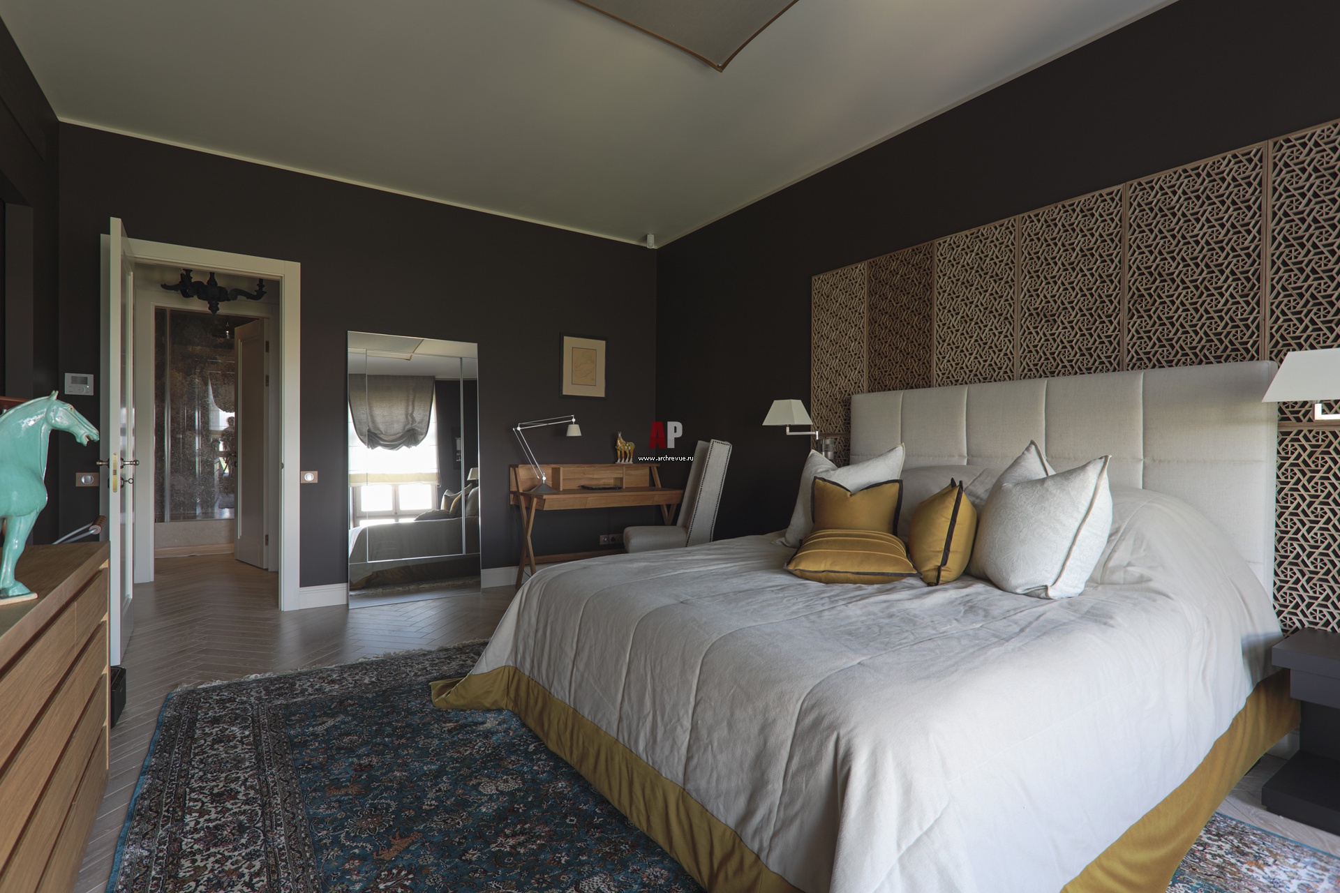 Фото интерьера спальни. На полах всех жилых помещений использован паркет из дуба под маслом, укладка широкой елкой придает комнатам черты классического интерьера и то же время зрительно их расширяет. Изголовье кровати украшено ажурными декоративными панно. Они сделаны вручную мастерами из Китая.