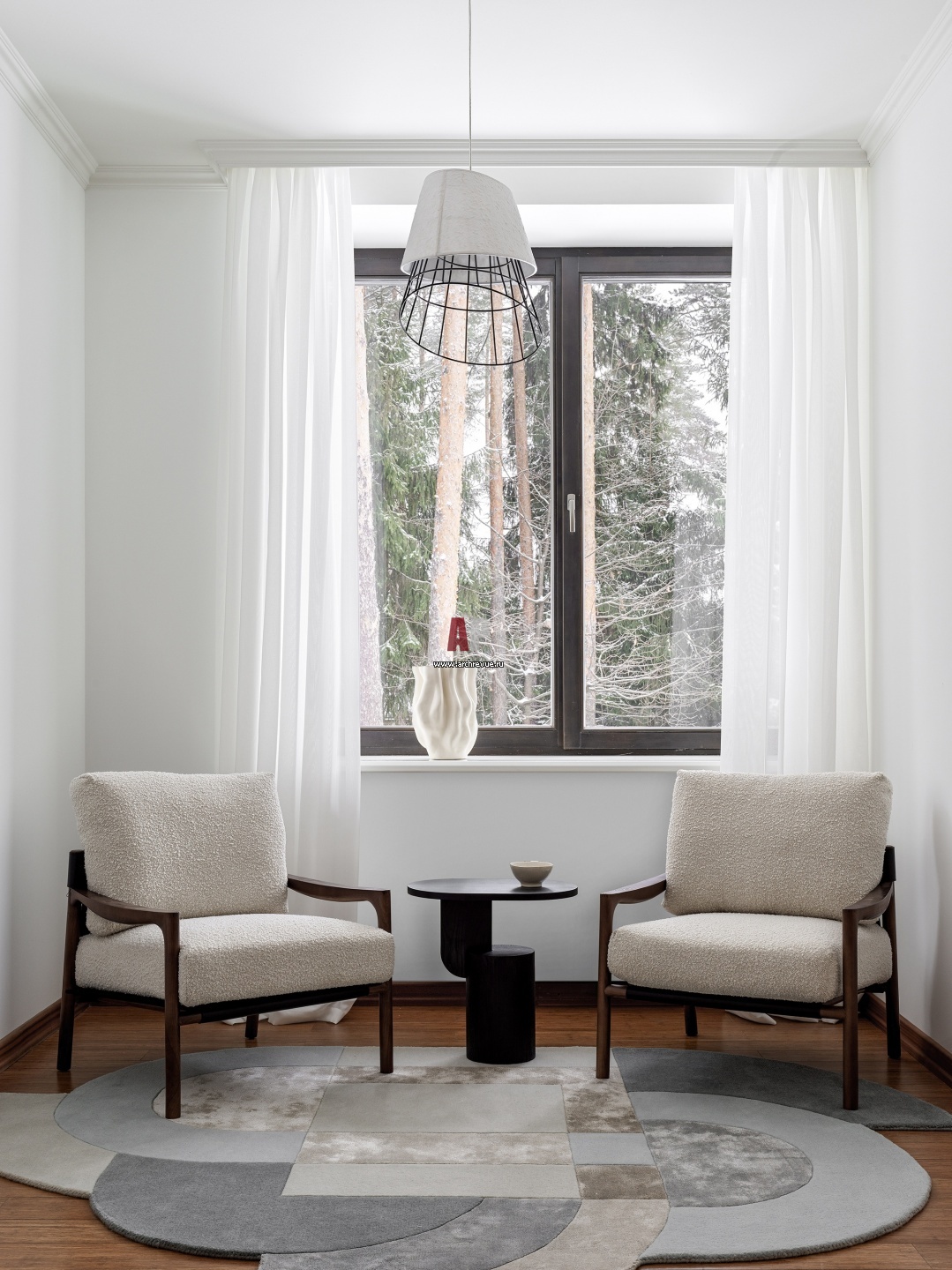 Холл второго этажа. Кресла, Porada. Столик, Ferm Living. Люстра, Karman. Тарелка работы Тани Звягиной.