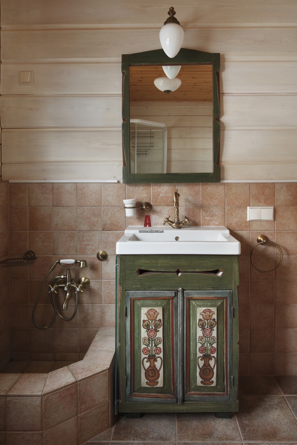 Гостевой санузел на первом этаже деревянного дома. Подстолье умывальника украшено ручной росписью.