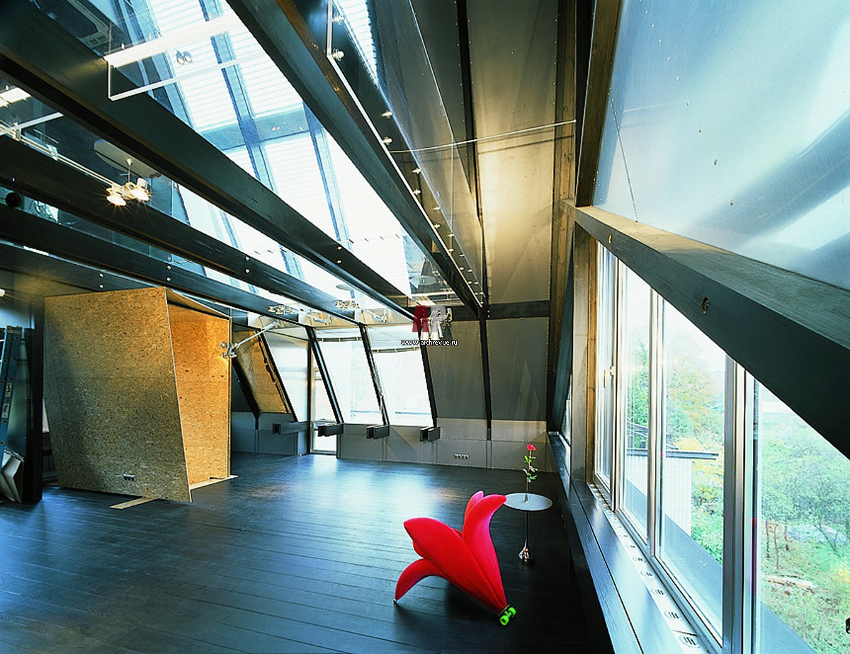Зона отдыха в мансарде под острой кровлей. Стропила и балки выкрашены в черный цвет.