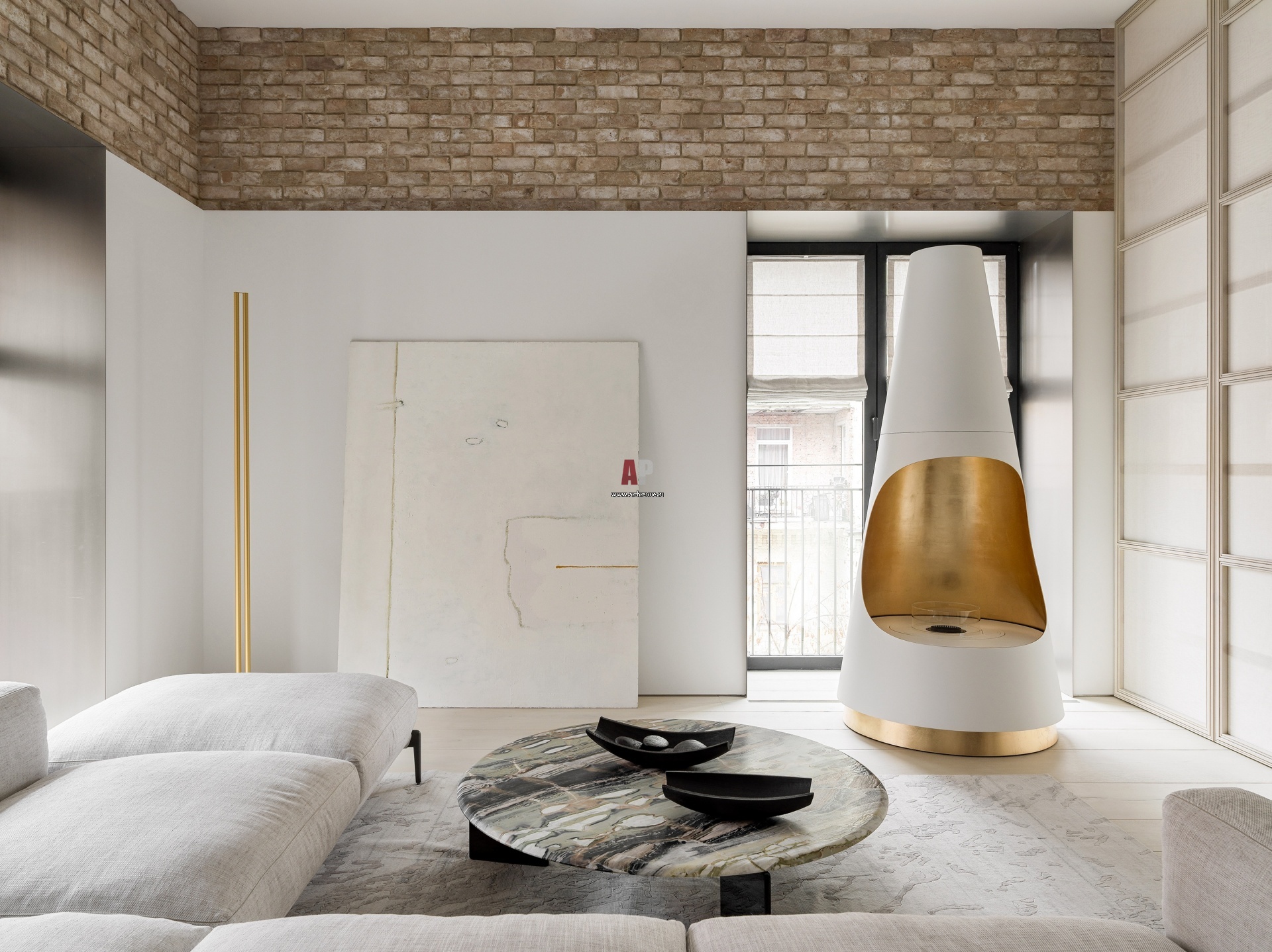 На полу использована доска из континентального дуба в обработке «Кантри», с сучками и потертостями, разной длины и ширины. Ширина досок варьируется от 25 до 40 см, а длина – от 300 до 500 см. Оконные откосы отделаны шлифованной сталью.