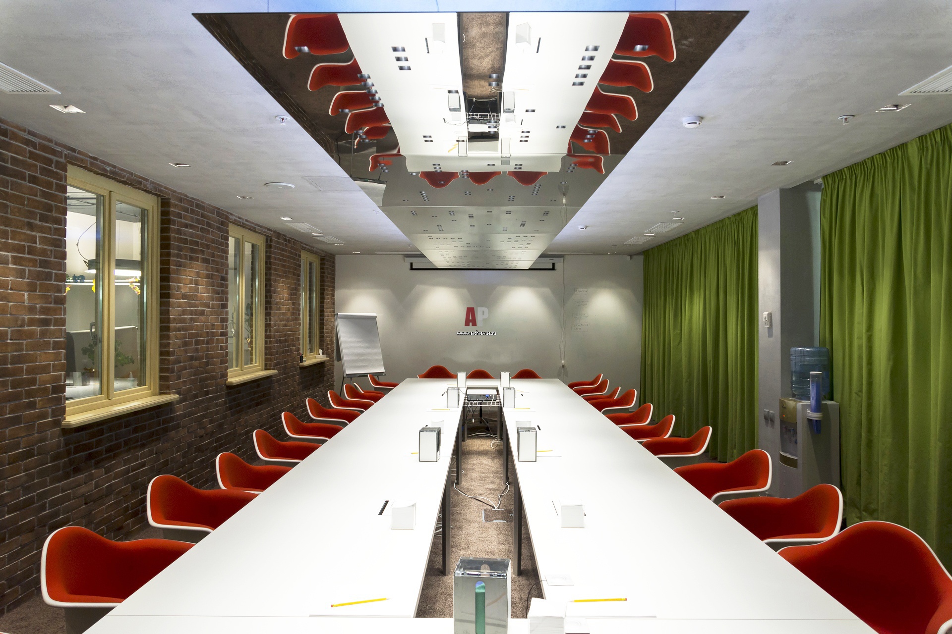 Прямоугольная переговрная с возможностью проведения переговоров и аудиоконференций с клиентами и между разными территориальными подразделениями работает на имидж компании. Яркая деталь функционального интерьера – зеркальный светильник Xal, в котором отражаются сидящие за столом.