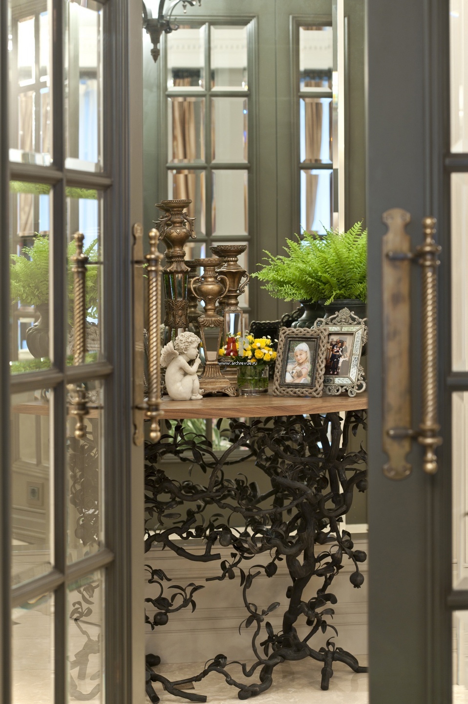 Фрагмент интерьера дома с элементами ар-деко и американской неоклассики. Консоль с кованым основании в виде яблони, Edward Ferrell + Lewis Mittman.