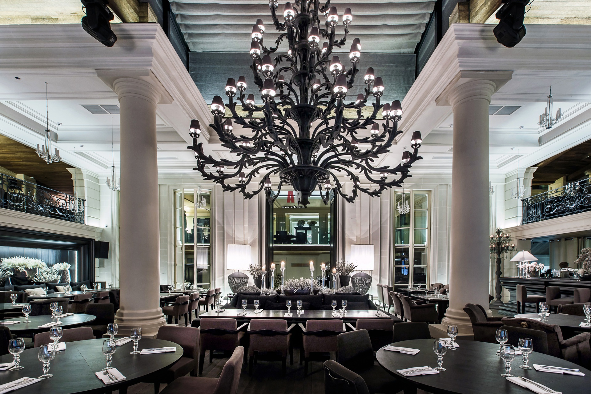 Интерьер основного зала ресторана со световым фонарем и лепными колоннами. Центральная пятиметровая люстра выполнена из дерева и выкрашена в черный цвет.