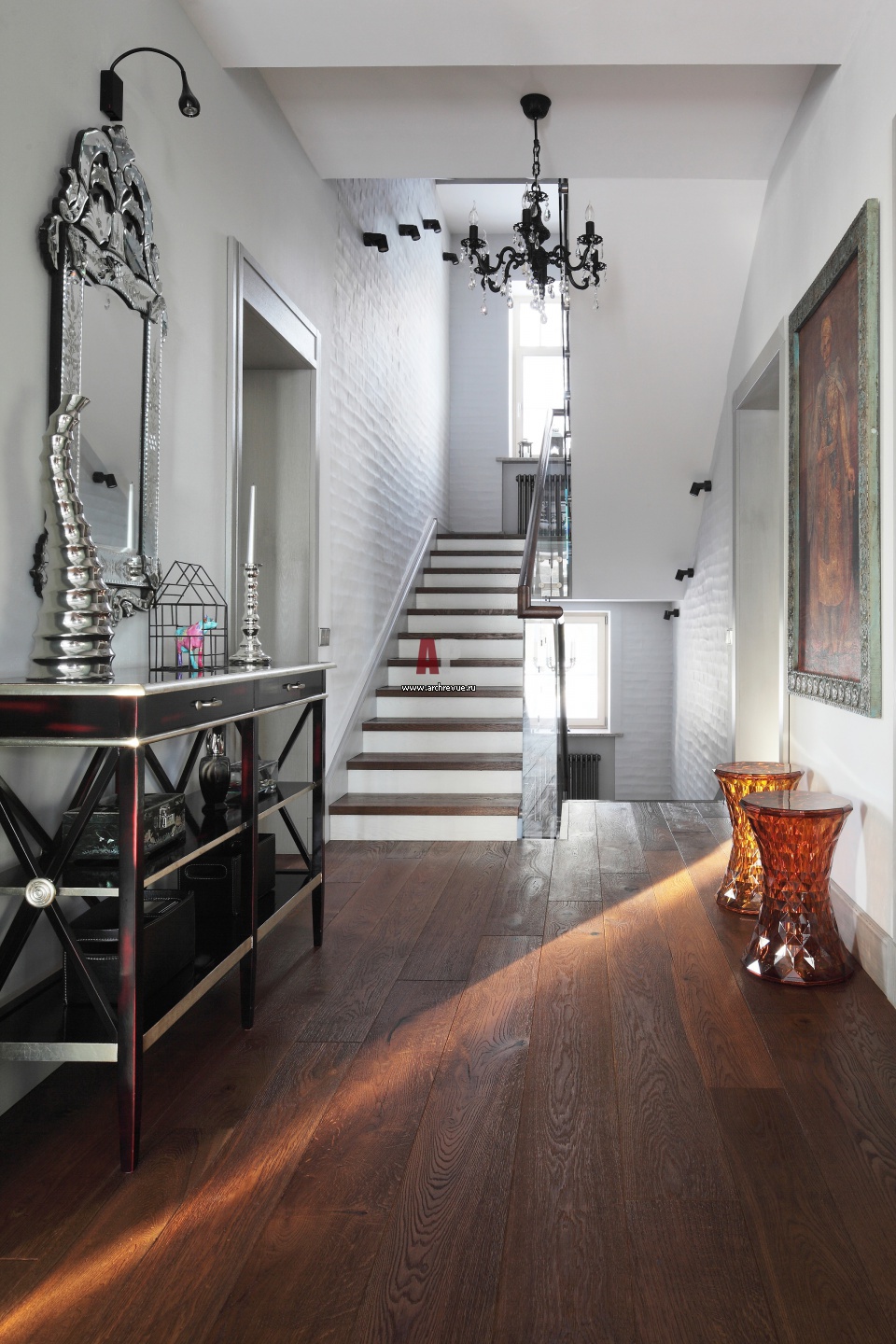 Парадная входная группа и лестничный холл. Лестница с ограждением из стекла. Этажерка, Tosato. Подсветка зеркала, Fabbian.