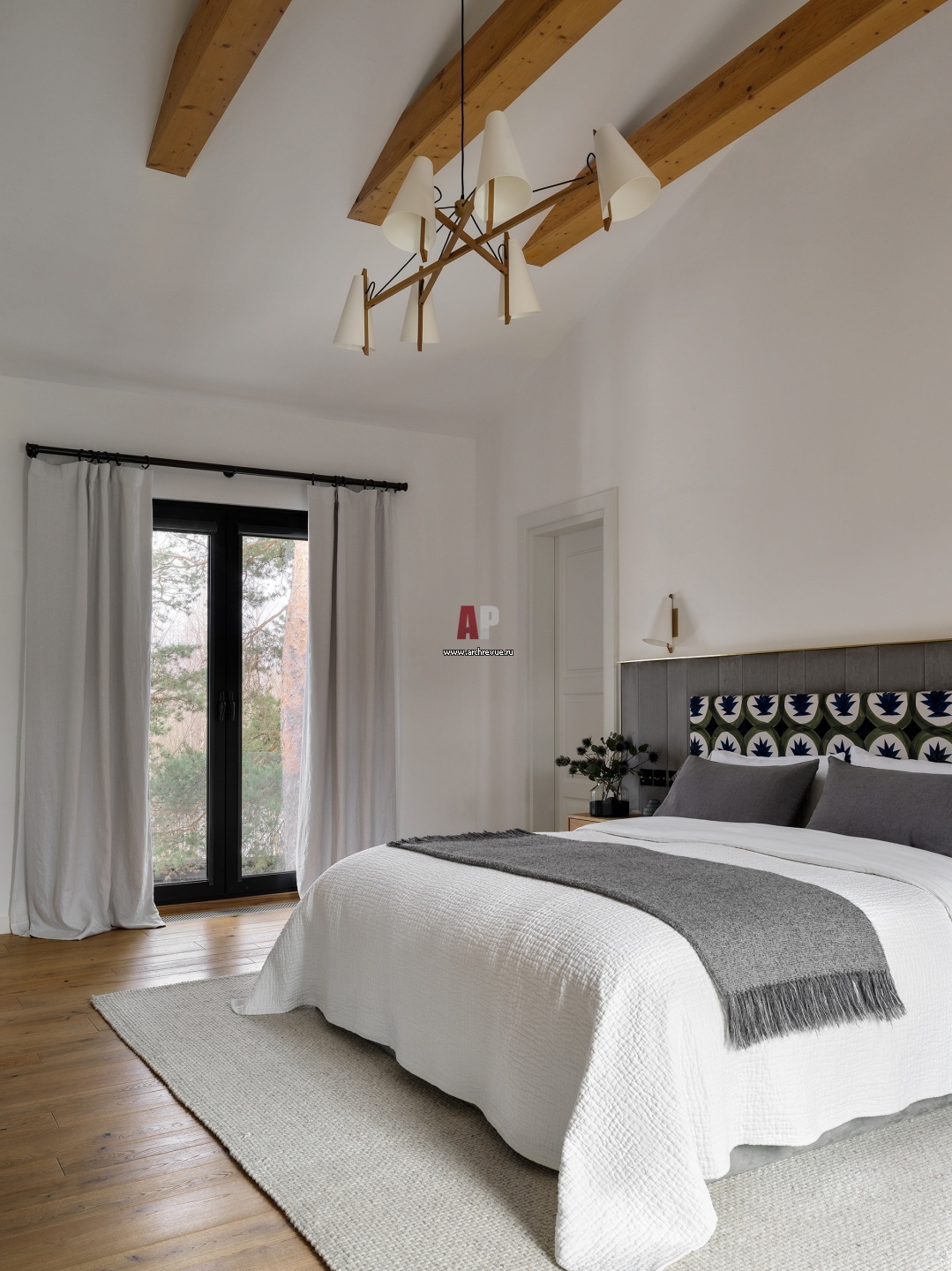 Мастер-спальня на втором этаже. При отделке и выборе материалов для мастер-спальни и мастер-санузла вдохновлялись окружающей природой, что отразилось в использовании разнообразных зелено-травяных оттенков.