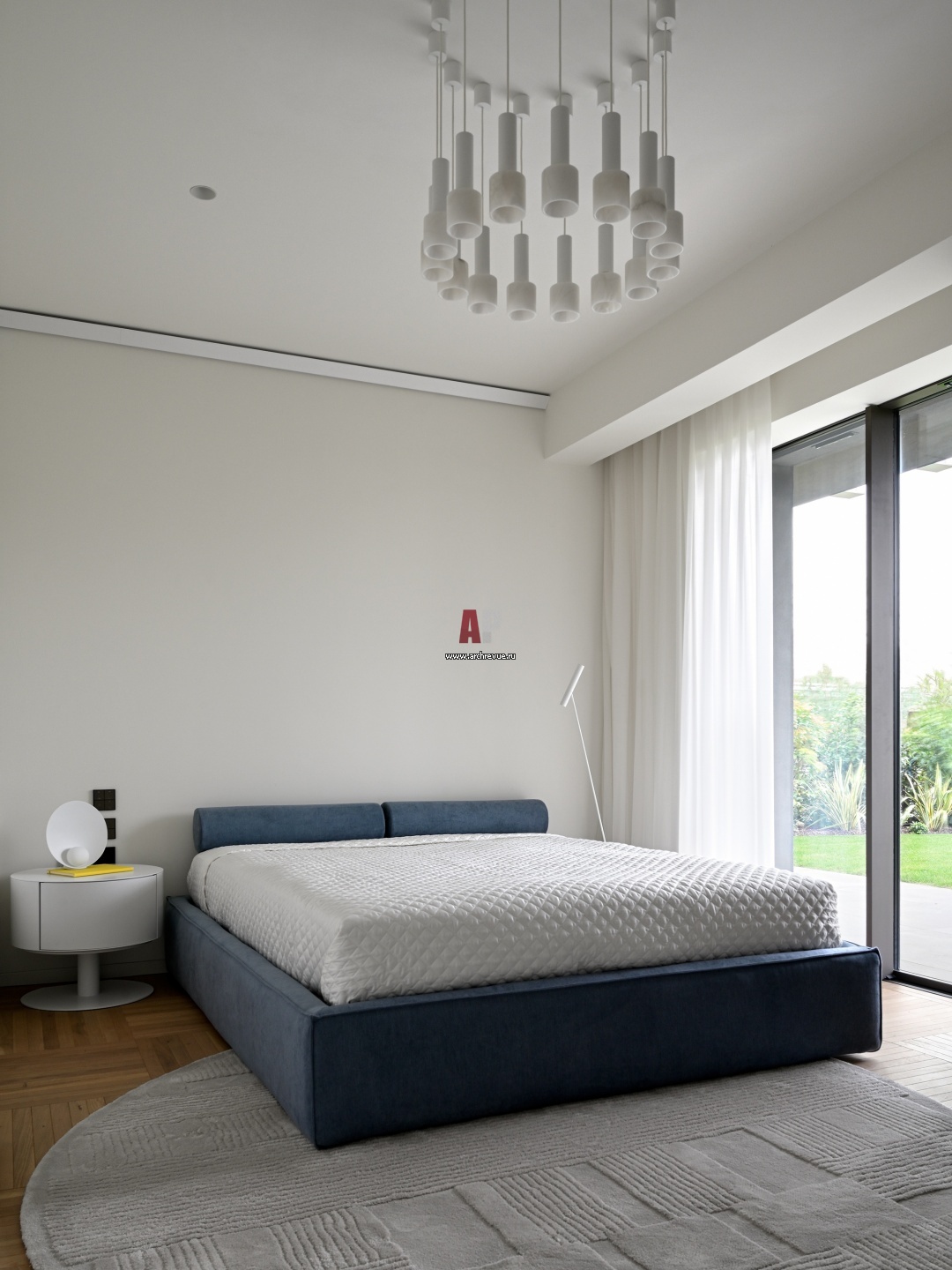 Комната дочери оформлена в нежных оттенках. Голубая минималистичная кровать, Twils. Матрас, Treca Interiors Paris. Прикроватная тумба, Opinion Ciatti.