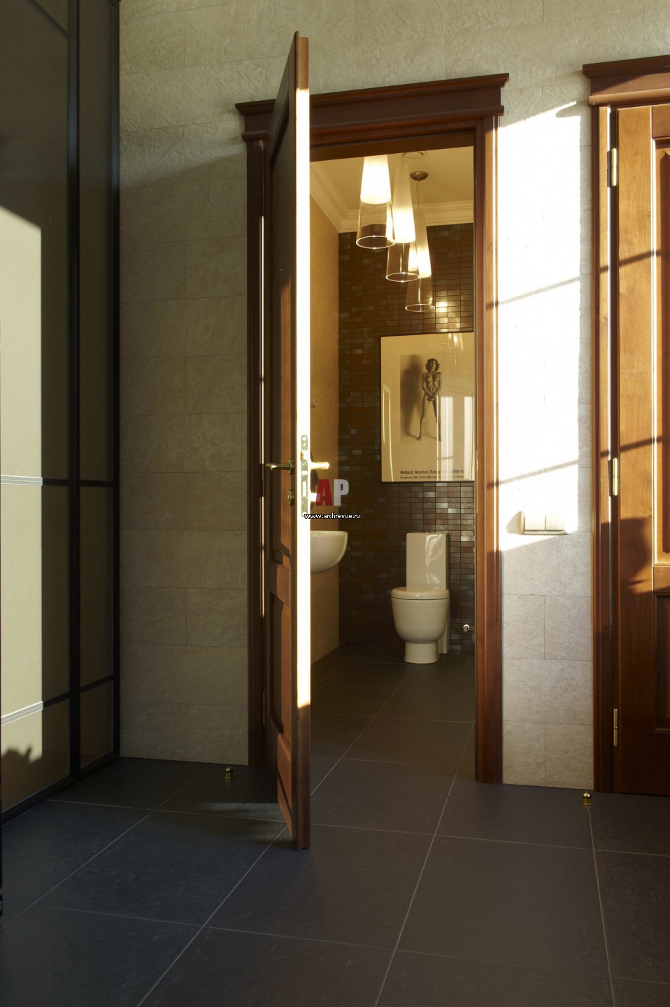 Интерьер гостевого санузла. На кирпичной стене – постер с изображением работы фотографа Хельмута Ньютона.