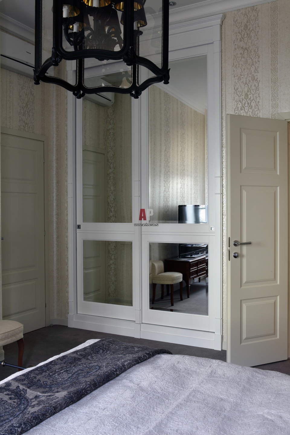 Интерьер спальни. Белый встроенный шкаф с зеркальными фасадами изготовлен по эскизам авторов проекта.