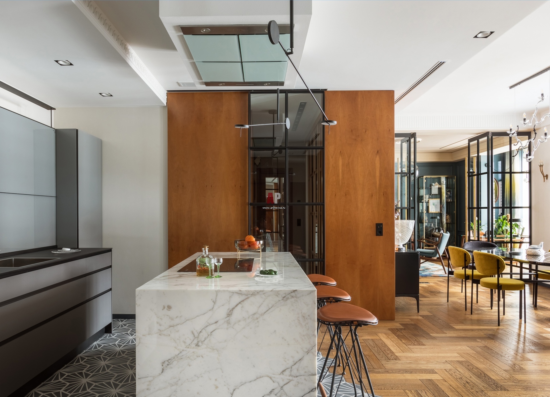 Зона кухни в общей гостиной. За барным островом находится выход в блок с гостевым санузлом и гардеробной, там же есть альтернативный вход в кабинет. Стены зашиты деревянными панелями. Раздвижная дверь, черный металл, стекло.