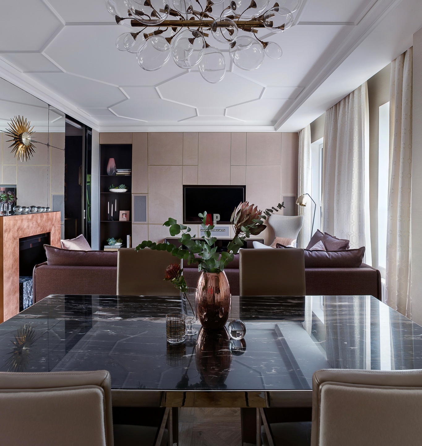 Спокойная квартира для творческой семьи. Гостиная выполнена в нейтральной гамме, использованы оттенки пыльной розы. Гипсовая лепнина и встроенные светильники, Atelier Sedap. Тканевые обои, Omexco. Люстра, IDL.