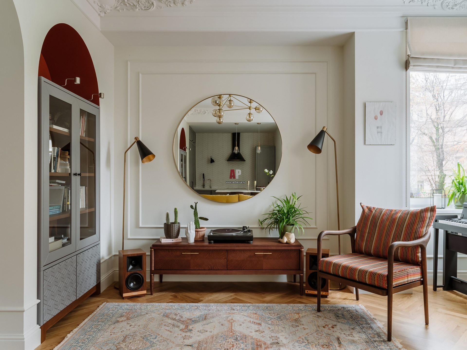 Квартира с атмосферой старой Москвы для интеллигентной семьи. В интерьере присутствуют элементы в стиле ретро и мебель в духе 1960-70-х годов. На тумбе Dantone Home – виниловый проигрыватель.