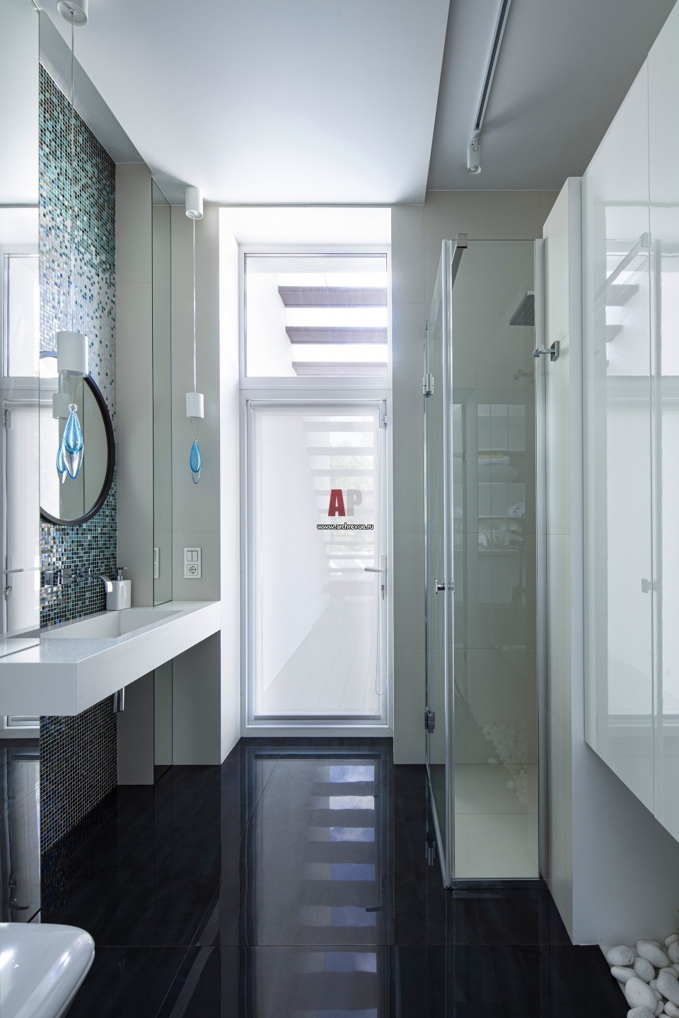 Ванная комната при спальне хозяев. В оформлении использован глянцевый керамогранит, отраженные в нем окна и блики добавляют еще больше света в помещение.