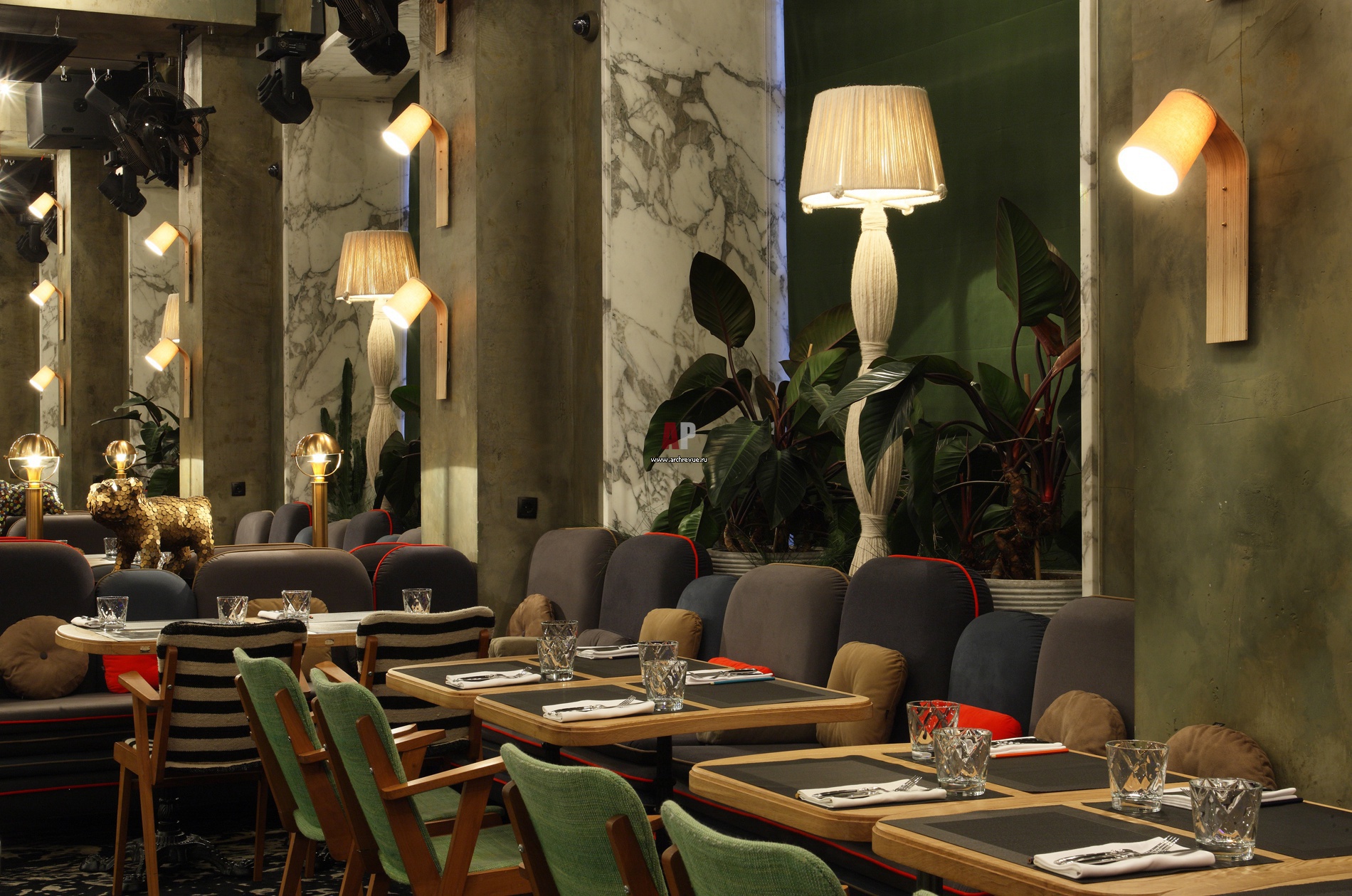 .В интерьере использованы оригинальные авторские изделия. Так, комоды, стойка диджея, диваны, креcла, тумбы и консоли, а также некоторые светильники сделаны по авторским эскизам Юны Мегре