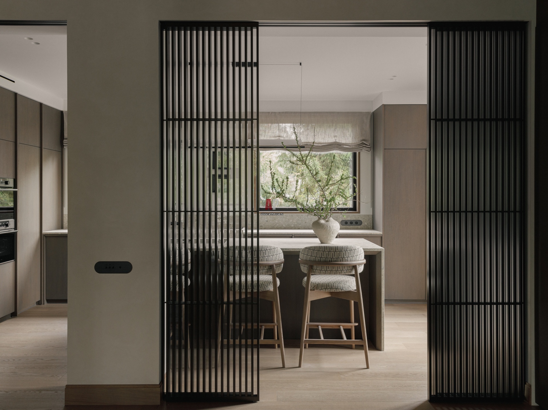 Кухня отделена от общей зоны первого этажа раздвижными перегородками с реечным оформлением.