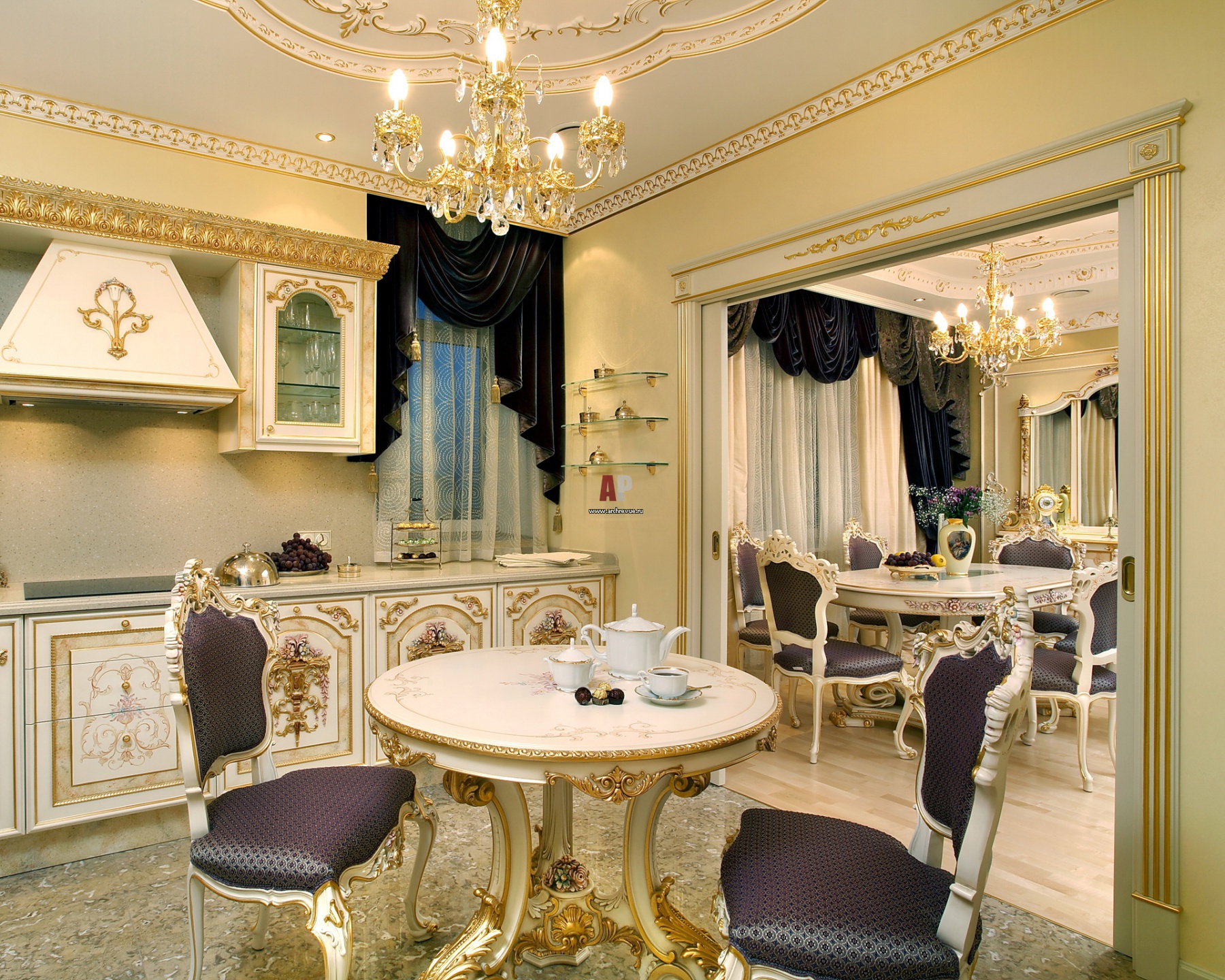 Столик для завтраков на кухне. Фасады кухни украшены резьбой и росписью, выполненными вручную.