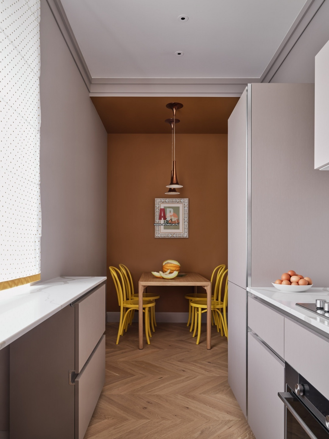 Кухня-столовая. Обеденная зона в нише выделена теплым терракотовым цветом стен. Обеденный стол, «Икеа». Венские стулья, винтаж.