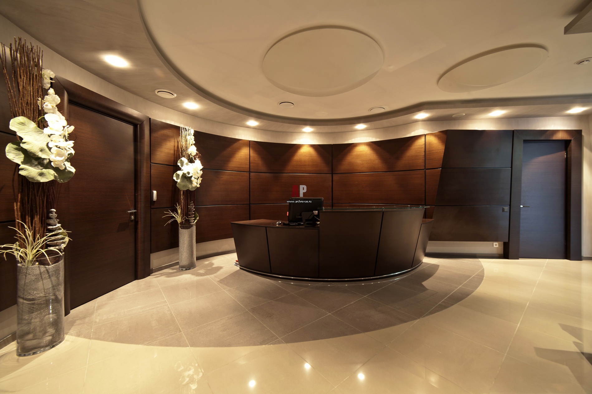 Зона ресепшен в стиле ар-деко. Полукруглая стойка ресепшен и радиусная стена за ней облицована панелями из венге, изготовление «Лигнаур».