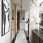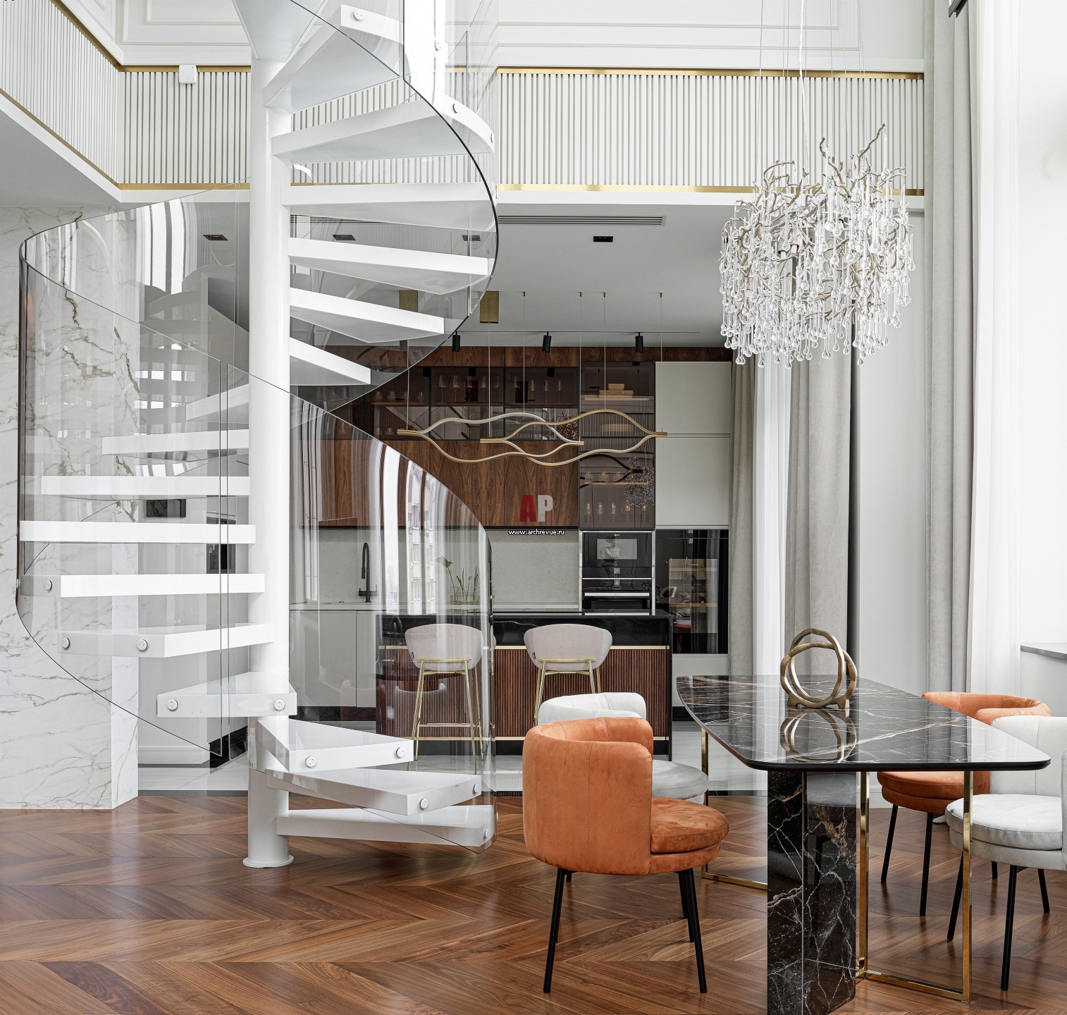 По центру гостиной расположена винтовая лестница со стеклянным ограждением. Это не просто функциональный элемент, связывающий два этажа, а арт-объект, современная скульптура. Эргономика лестницы позволяет удобно ее использовать и сохраняет нормальный проход на кухню.