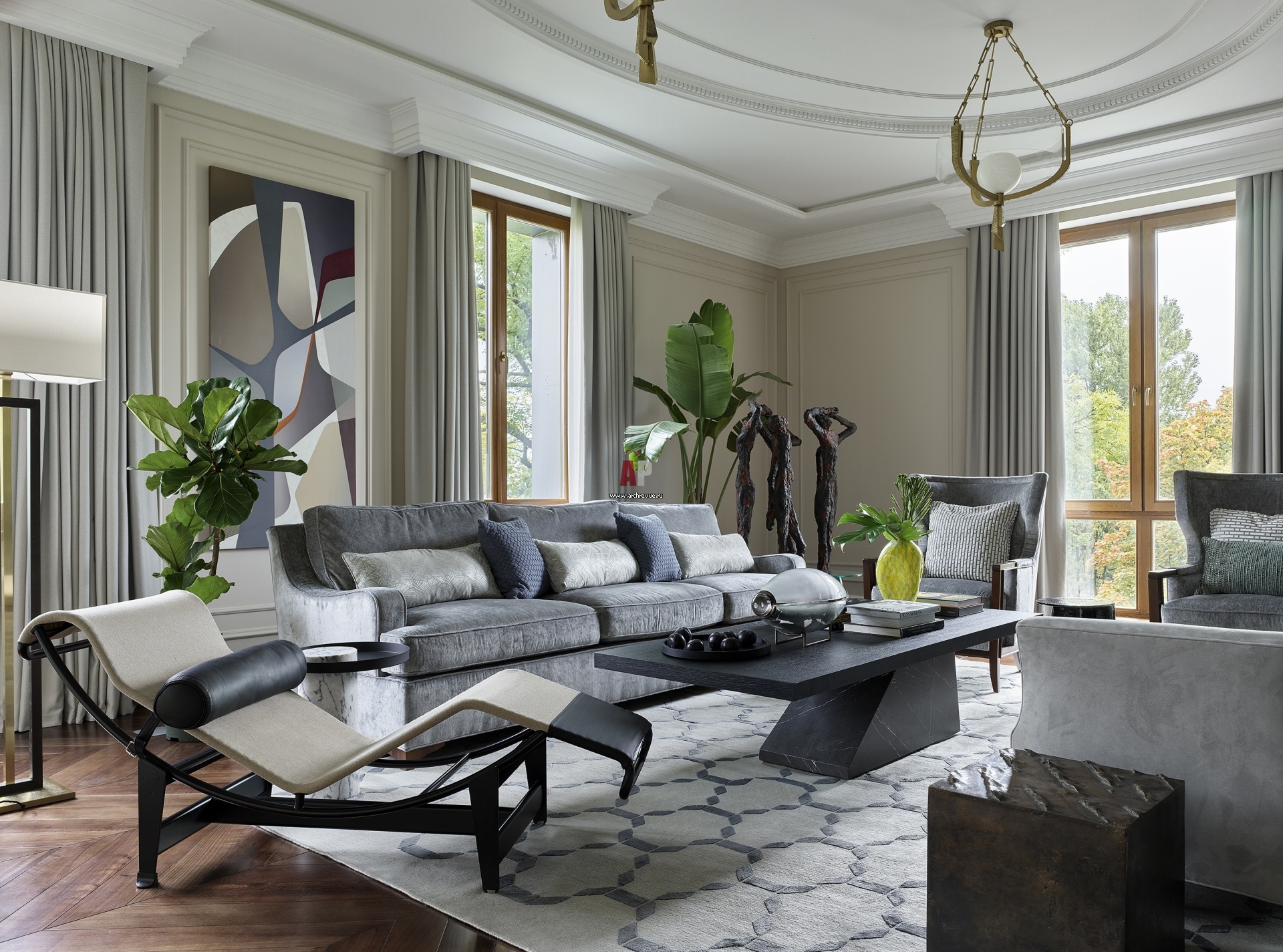 Интерьер гостиной строится на мягком контрасте теплого бежевого оттенка стен Designers Guild (цвет Cantucci) и серо-жемчужной гаммы мягкой мебели. В центре мягкой группы массивный журнальной стол из дерева и камня. На нем выставлены арт-объекты и предметы декора: скульптура «Звук» Ирины Бобровой и авторская ваза «Желтая» керамиста Николая Третьякова. В глубине комнаты – бронзовая скульптура Muse Thalia от Gardeco objects.