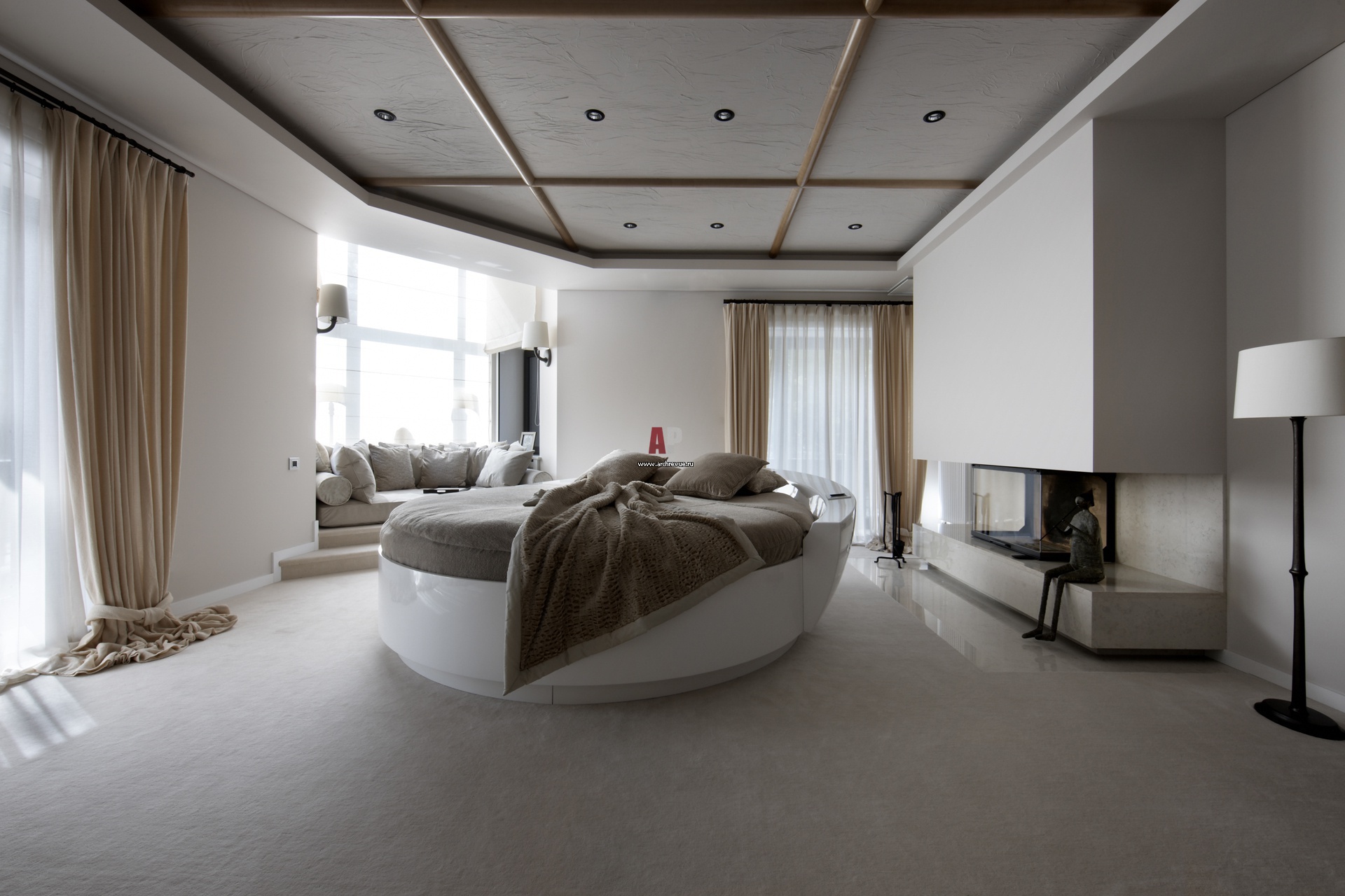 По центру спальни – моторизированная круглая кровать в белом лаке. Корпус кровати выполнен по эскизам авторов проекта.